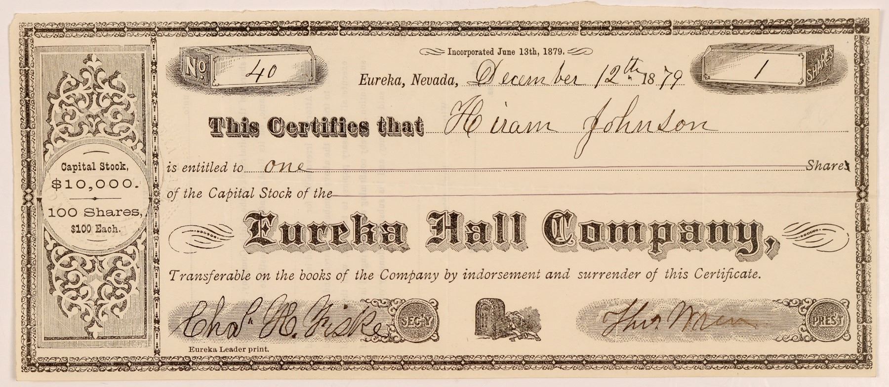 Inc. in June 1879. No. 40, issued for one share to Hiram Johnson, one of the largest merchants in Eureka, on Dec. 12th, 1879 in Eureka. Signed by the president (illegible) and secretary Shas. Fiske. Not cancelled. Black border and print, small vignette of dog next to safe. Eureka Leader print. Folds. 4 x 9.5" After a disastrous fire on April 18, 1879, the company formed and built a new opera house. Ken Prag Collection