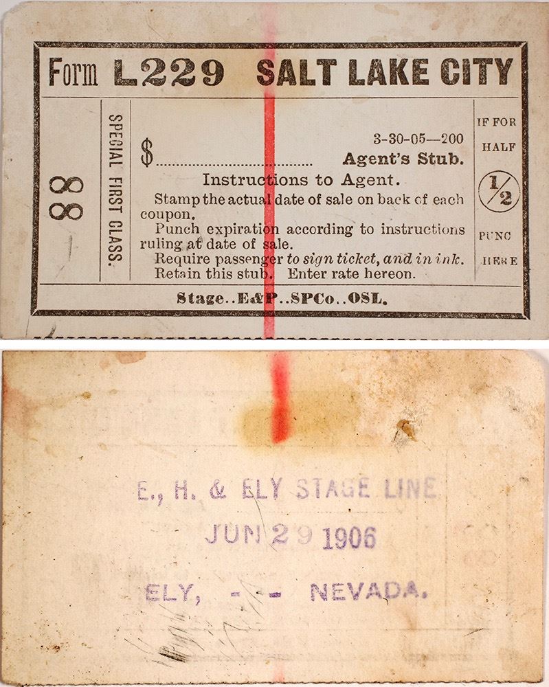 Passenger ticket from Ely to Salt Lake City. One side of the ticket is Form L229, Salt Lake City, Stage, E&P, SPCO. Reverse is stamped E., H. & Ely Stage Line / June 29 1906 / Ely,--Nevada. 2 x 3" Some soiling. (Potter Collection) HWAC# 59934 Date: Location: Ely, Nevada
