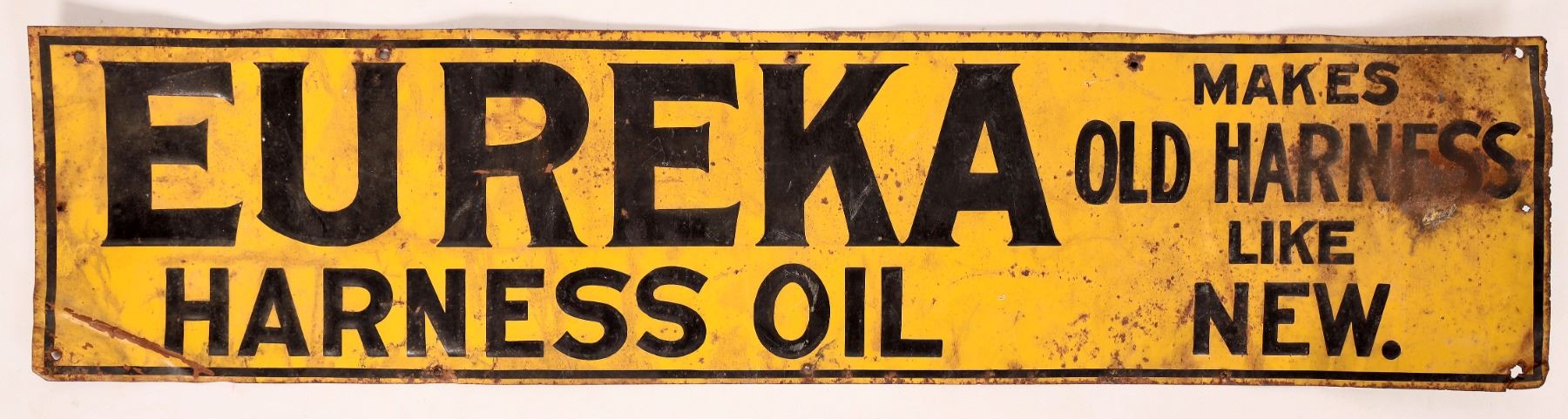 This is an original 5"x 19" Eureka Harness Oil metal sign. Eureka Harness Oil was a product from the Standard Oil Company and told customers that "A good looking horse and a poor looking harness is the worst combination." Sign is warn but still an attractive piece of advertising. Please see photos for more details. California