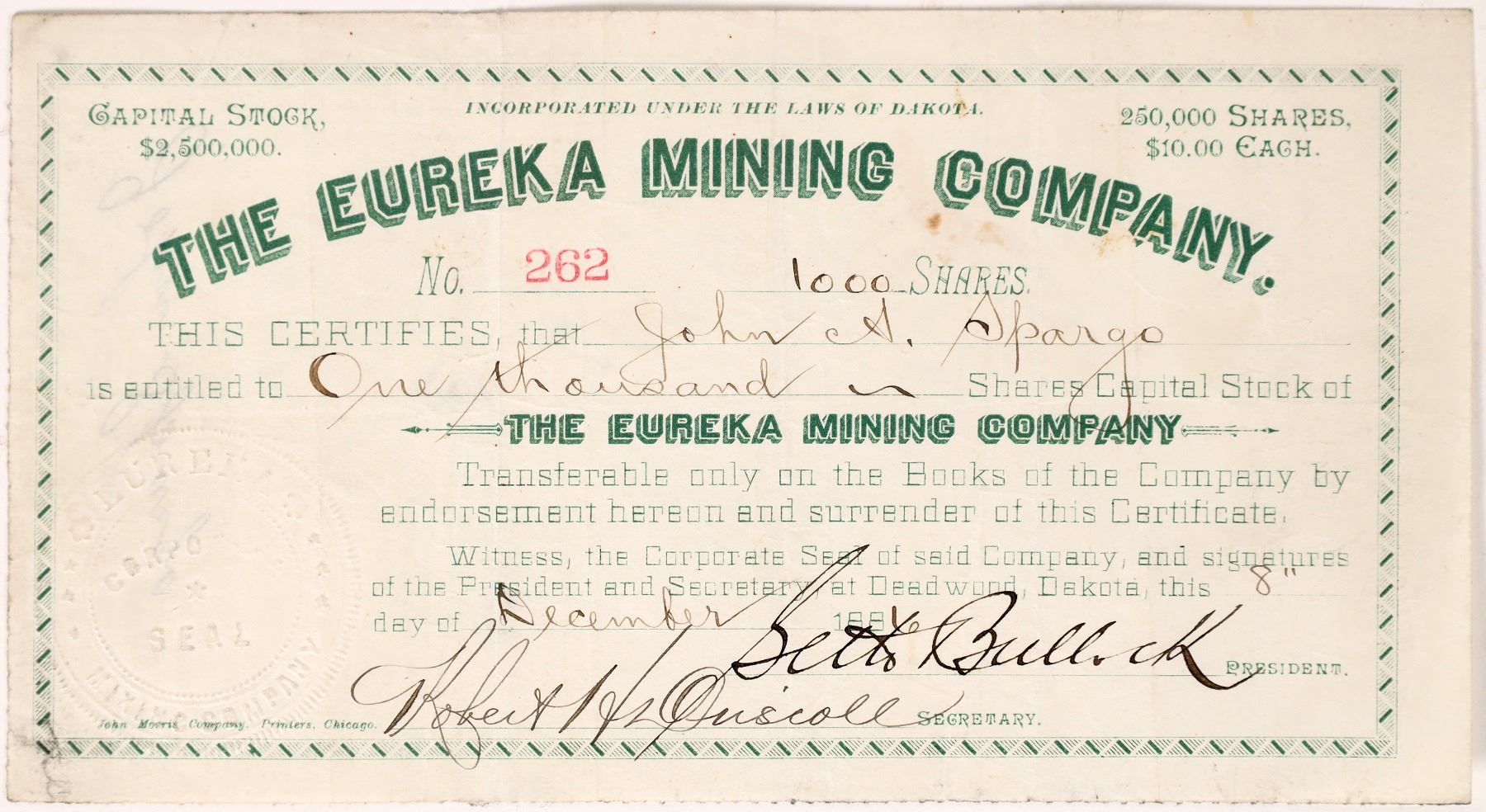 No. 262 for 1000 shares to John A Spargo signed by Seth Bullock as president. Dated December 8, 1886. Issued/uncancelled. While there are many autographs of financial figures with stories yet to be told, Seth Bullock has always been a favorite. A "wild west" lawman, Bullock is ever-popular, appointed as Deadwood's first Sherriff. after Bill Hickock was murdered by McCall. Spargo was a member of the local IOOF. Uncancelled United States of America