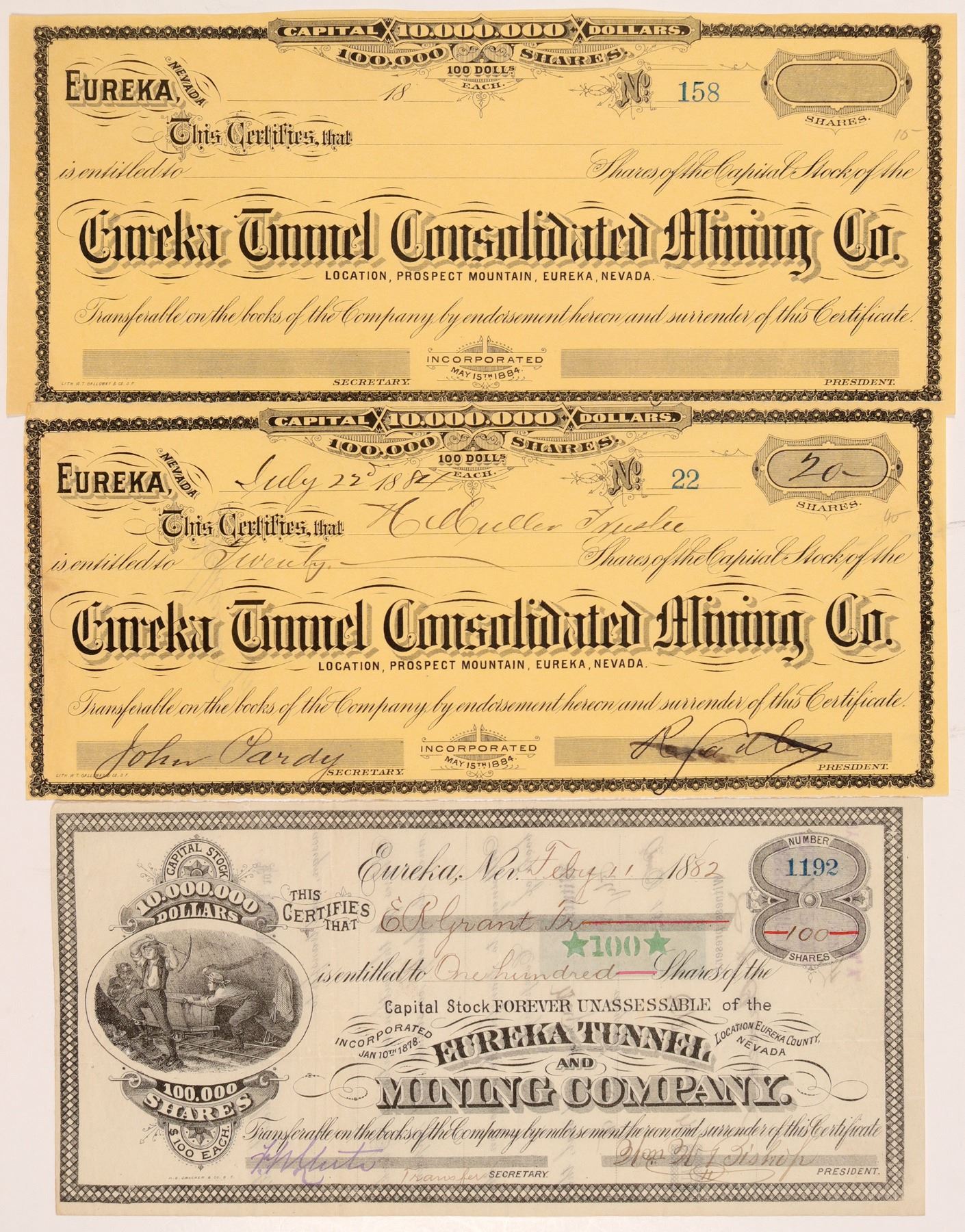 Lot of three, two different companies. 1) Eureka Tunnel and Mining Company. Inc. 1878. No. 1192, issued for 100 shares to ER Grant on Feb. 11, 1882 in Eureka. Signed by president Wm. Bishop and the secretary. Not cancelled. Black border and print, mining vignette. HS Crocker, SF. Pinholes, folds. 4 x 8.75" 2) Eureka Tunnel Consolidated Mining Company. Location: Prospect Mountain, Eureka, Nevada. Two certificates, one unissued and one issued. No. 22, issued for 20 shares to Huller on July 22, 1884 in Eureka. Signed by the president and secretary Pardy. One signature is pen cancelled. Black border and print on yellow paper. Folds, some glue residue on reverse. 4 x 9" Ken Prag Collection