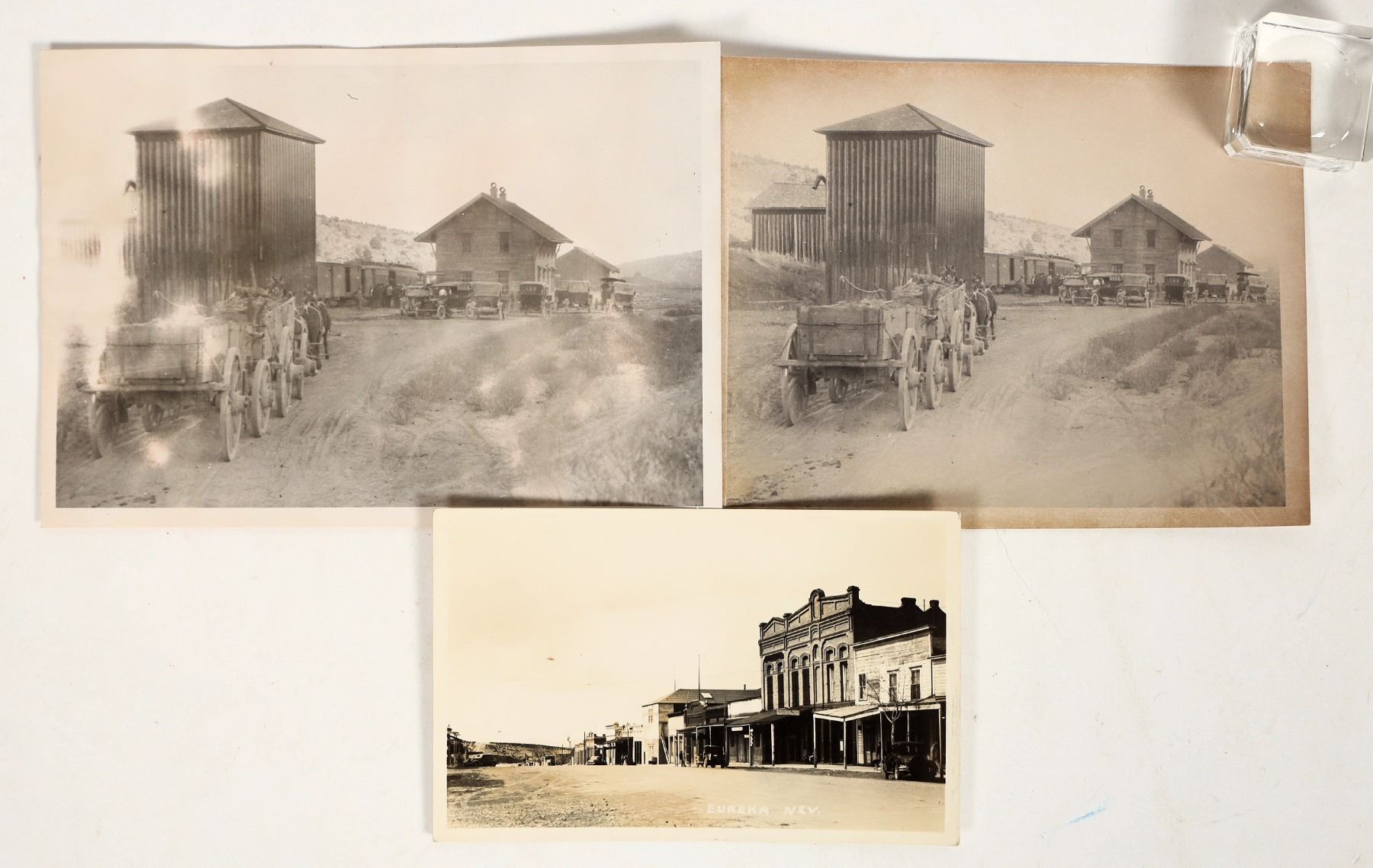 Lot of 3. Two prints of an early Eureka & Palisade Railroad depot scene. You can see early autos, train cars, and even a wagon in the front. 5 x 6" and 5 x 7". Condition issues. Also included is an RPPC street scene of Eureka with early cars visible.