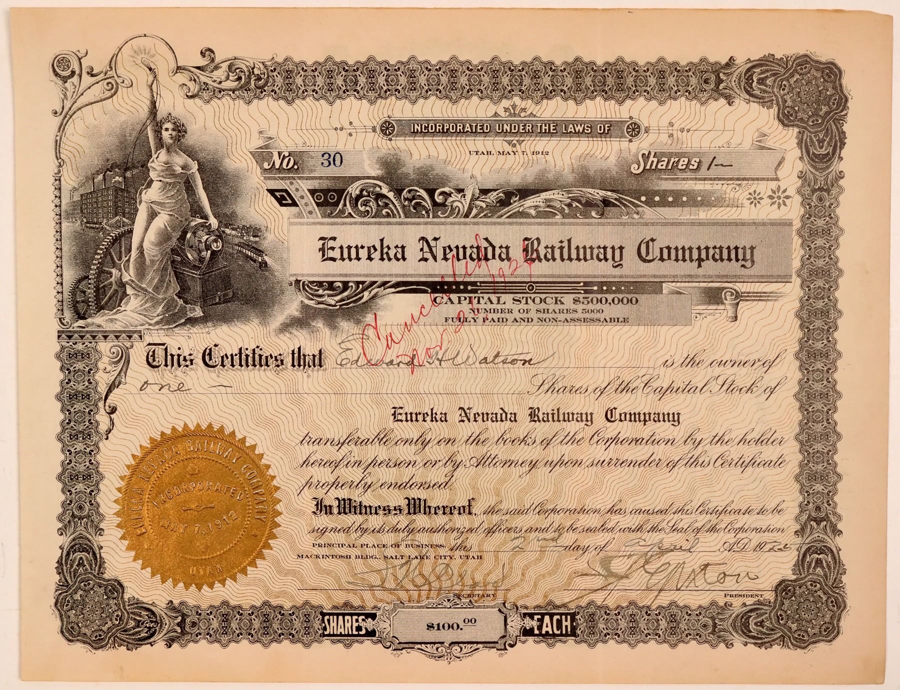 The Eureka Nevada Railway Company was the successor of the Eureka & Palisade Railroad. George Whittell (Lake Tahoe fame) saved the railroad, renamed it, and in 1921 had it running again. The last train ran in 1938. This rare stock (#30 for 1 share) was issued and cancelled in 1925. (Toth V&T collection). Vignette top left allegorical female sitting on generator holding light bulb. Goes printer.
