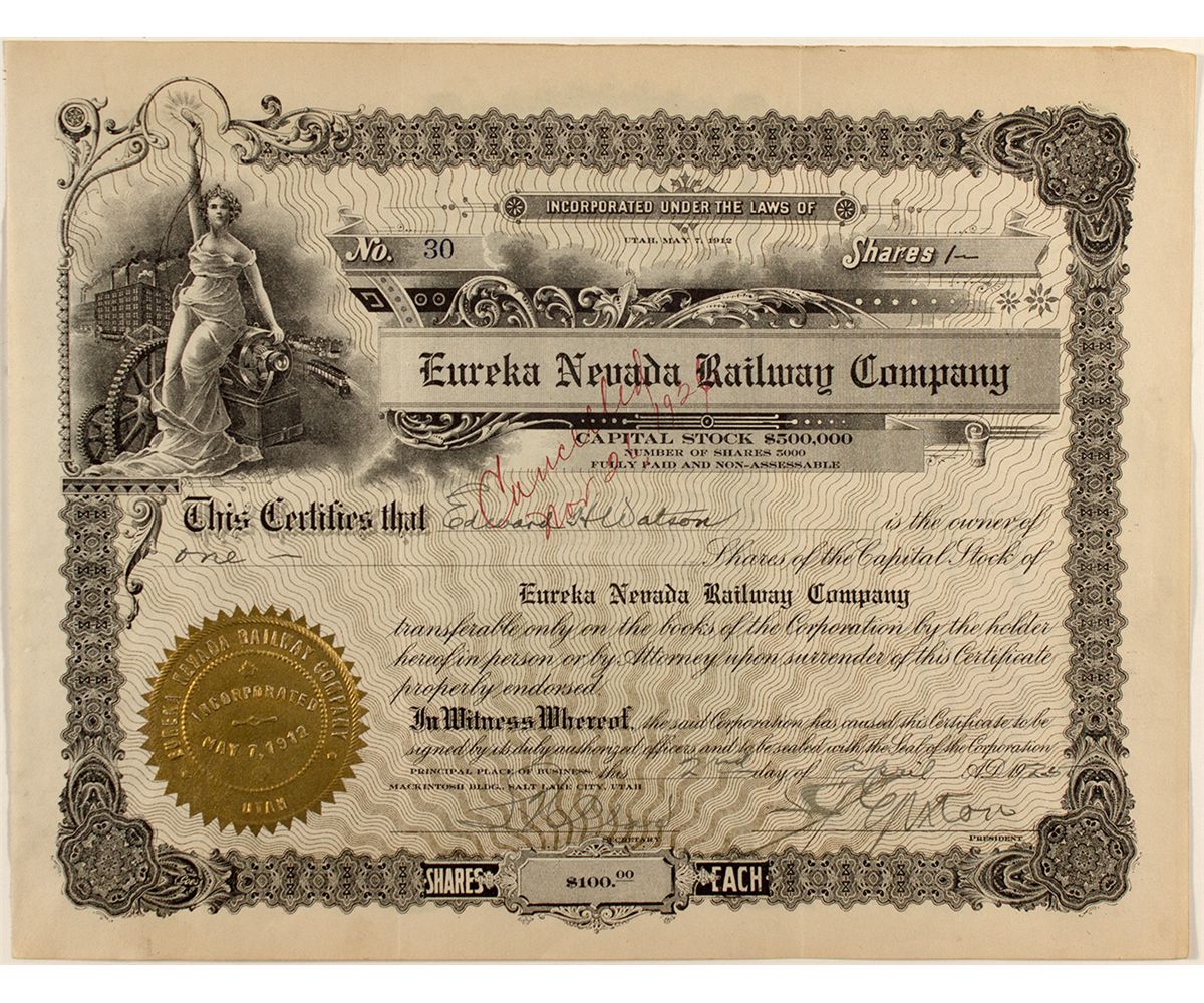 The Eureka Nevada Railway Company was the successor of the Eureka & Palisade Railroad. George Whittell (Lake Tahoe fame) saved the railroad, renamed it, and in 1921 had it running again. The last train ran in 1938. This rare stock (#30 for 1 share) was issued and cancelled in 1925. (Toth V&T collection)City: EurekaCounty: EurekaState: NVDate: