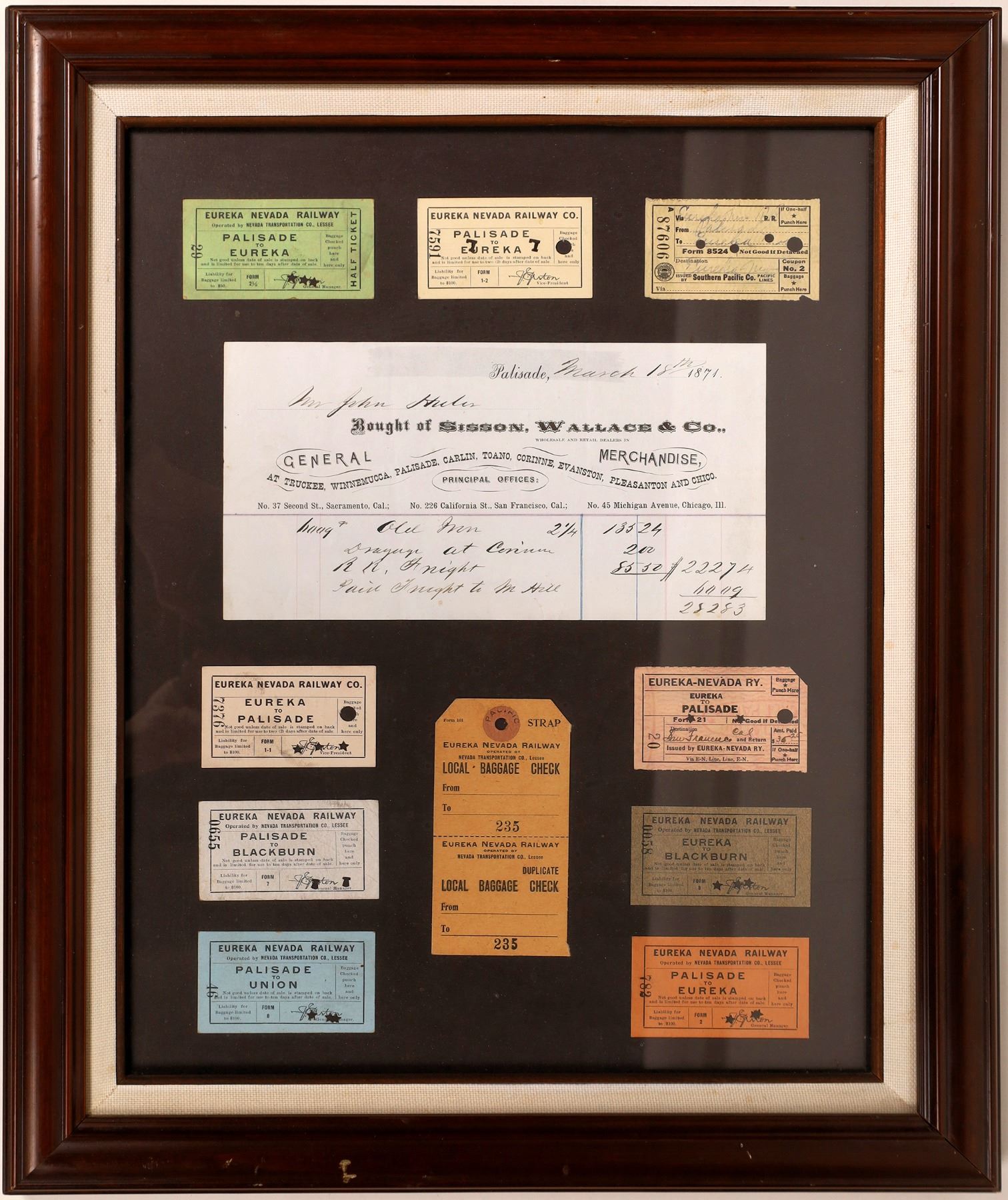 Framed display featuring nine punched tickets from the Eureka Nevada Railway, a baggage check and a freight bill. It's nicely displayed in a mounting and frame that measures 19"x 15" and is ready to hang. Please see photos for more detail and condition.
