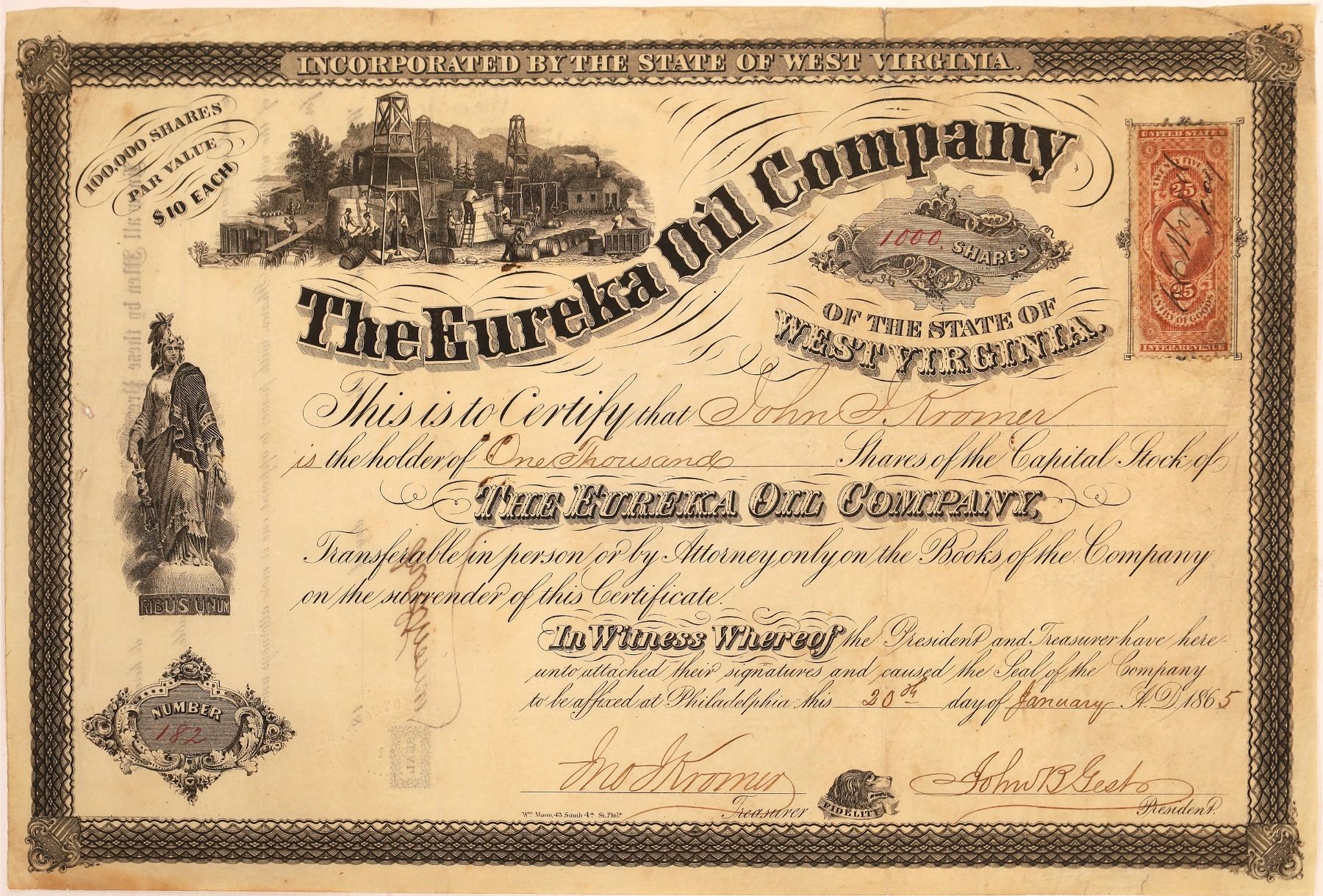 #182 for 1,000 shares to John Kromer on January 20, 1865. Signed by president Gest and secretary Kromer. Oil field vignette and allegorical vignette. Printed by Mann of Philadelphia. 25-cent Entry of Goods revenue stamp. West Virginia has been a very important oil producing state. The Volcano oil field was discovered in 1860. State:West Virginia City:Pleasants County Date:1865 Provenance: