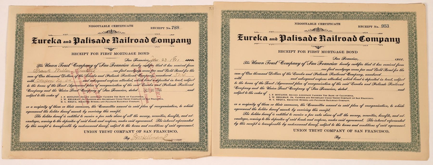 Lot of 2. Eureka and Palisade Railroad Co receipts for 1st Mortgage Bond. Extremely rare and in good condition. Receipt #788 cancelled (March 16, 1901) issued to Frank Miller, Trustee on January 23, 1901 signed by J. M. Telluauf, secy. Receipt #953 not issued. Eureka & Palisade Railroad was built in 1873-1875 between Palisade and Eureka, Nevada. Railroad built to connect Eureka, center of a rich silver mining area with the national railway network at Palisade. Financial problems lead to reorganizations and name changes to Eureka and Palisade Railway and then Eureka Nevada Railway. Line run by John Sexton, but floods and fires along with less ore being moved ended the line and rails removed in 1938. The Eureka, one of the railroad's only surviving steam locomotives, is listed on the United States National Register of Historic Places. Prag collection.