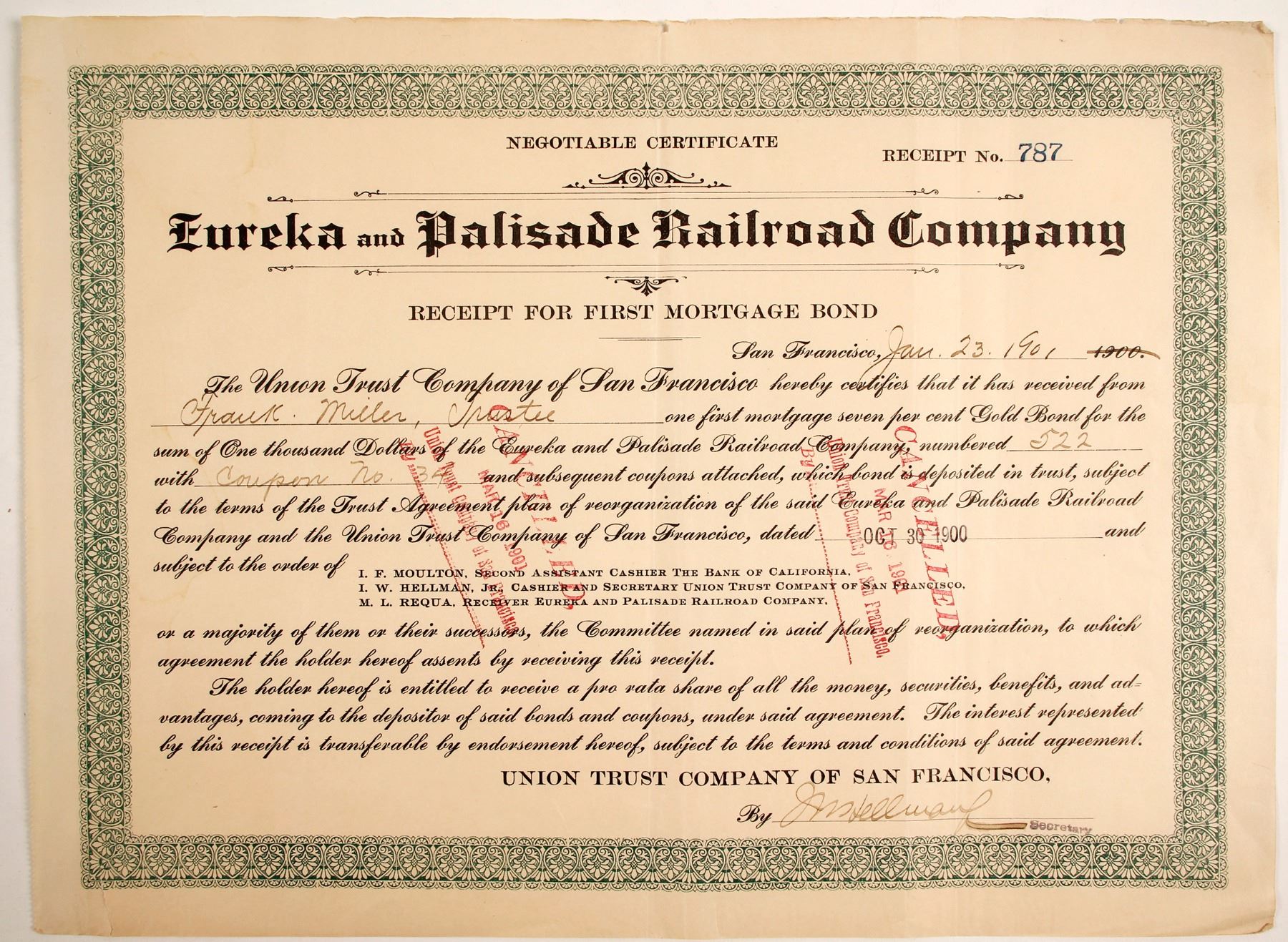 $1,000 cancelled Negotiable Certificate for Eureka & Palisade Railroad Company. Receipt for 1st Mortgage Bond. !st mortgage 7% Gold Bond. Green border Inc. CA. Dated Jan 23, 1901, issued to Frank Miller, Trustee. Eureka & Palisade Railroad was a narrow gauge railroad built from 1873-1875 between Palisade and Eureka, NV, about 85 miles. Railroad built to connect Eureka, the center of a rich silver mining area, with Palisade which connected the national railway network. Due to financial concerns and reorganizations railroad became "Eureka and Palisade Railway" and then "Eureka Nevada Railway." Eureka & Palisade Railroad was built in 1875 to carry silver-lead ore from Eureka, NV, to the Southern Pacific Railroad trunk line that ran through Palisade. John Sexton manager of the line, tried to keep line running but it succumbed to the effects of flood, fire, competing road traffic, and dwindling amounts of ore extracted in Eureka. The rails and rolling stock of the last surviving narrow gauge railroad in Nevada were removed in 1938. The Eureka, one of the railroad's only surviving steam locomotives, is listed on the US National Register of Historic Places. . Ken Prag Collection
