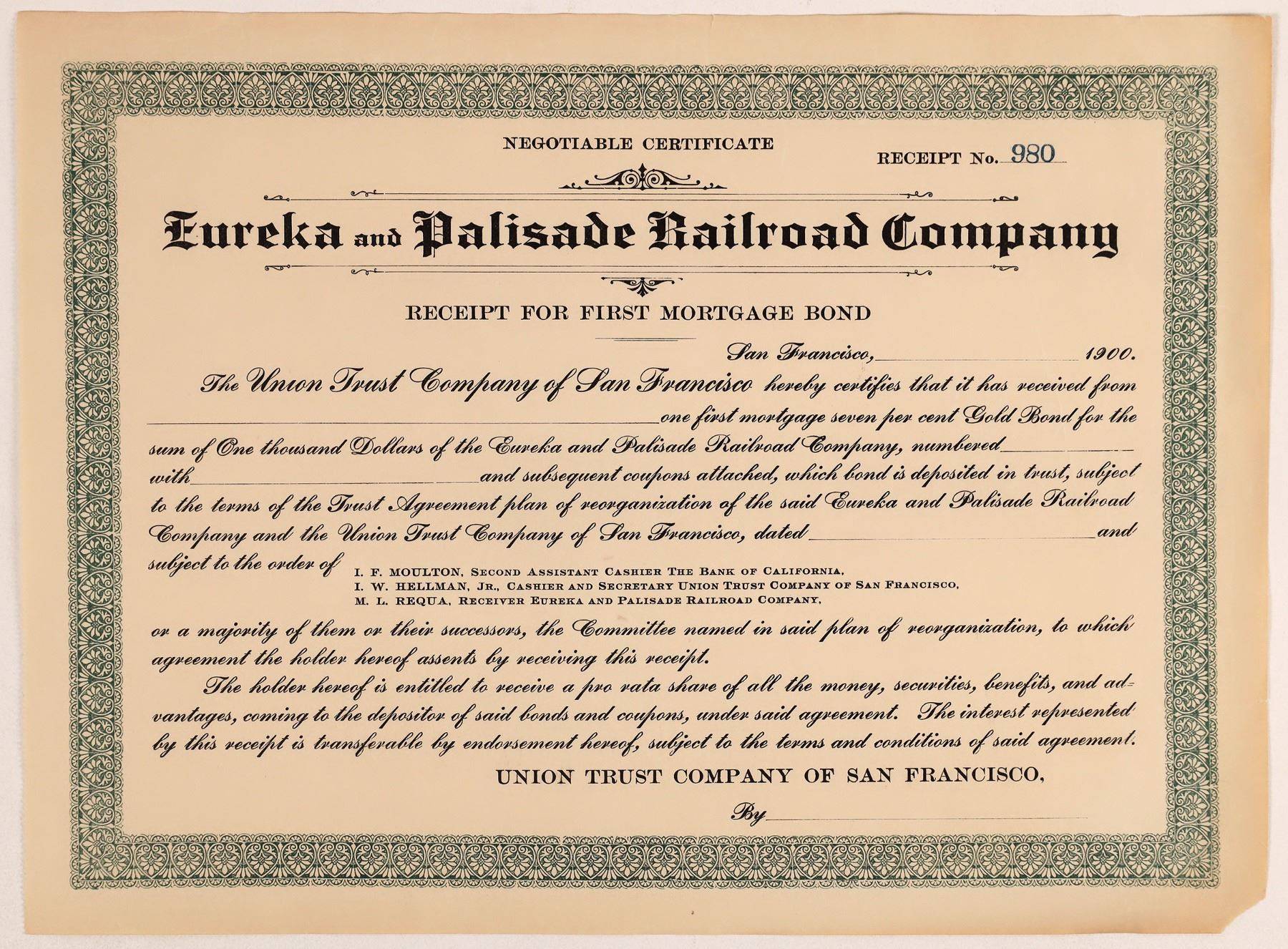 Rare. Negotiable Certificate Receipt for First Mortgage Bond, $1,000, 1900. Unissued. 8.75 x 12" Toning around edges, missing one corner. The Eureka & Palisade Railroad was a narrow gauge railroad built from 1873-1875 between Palisade and Eureka, NV, about 85 miles. Railroad built to connect Eureka, the center of a rich silver mining area, with Palisade which connected the national railway network. Due to financial concerns and reorganizations railroad became "Eureka and Palisade Railway" and then "Eureka Nevada Railway." John Sexton, manager of the line, tried to keep line running but it succumbed to the effects of flood, fire, competing road traffic, and dwindling amounts of ore extracted in Eureka.