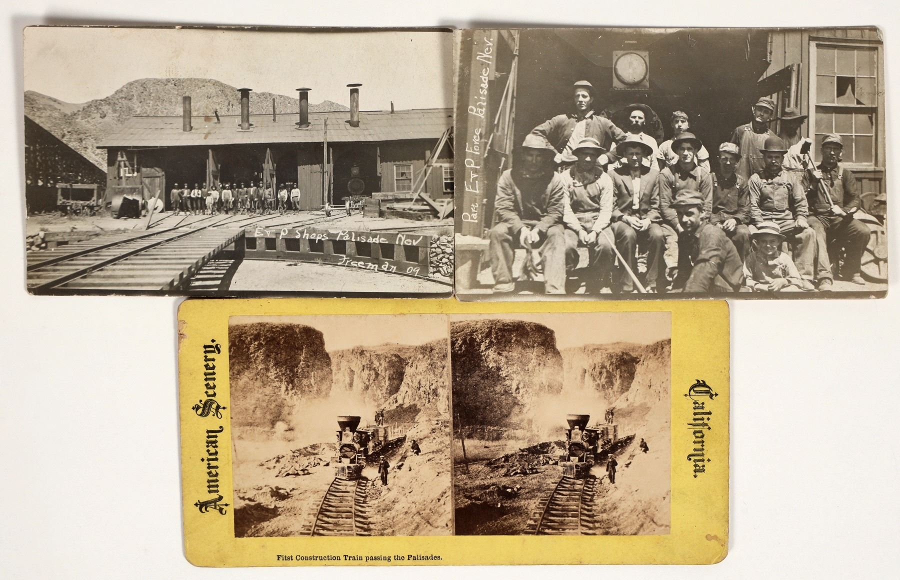 Great set of photos from the Eureka and Palisades Railroad at Palisades, Nevada. Stereoview shows the "First Construction Train passing the Palisades". Real photo postcards show the large train repair shop and the workers outside titled, "E & P Shops, Palisade, Nev", Freeman photo 1909. The second real photo card shows, "Part of E & P Force, Palisade, Nev." Twelve workers in their work clothes, one holding a long handled hammer. Both postcards were postally used and one has a 1909 postmark from Palisades. The stereoview likely dates to the 1880's.