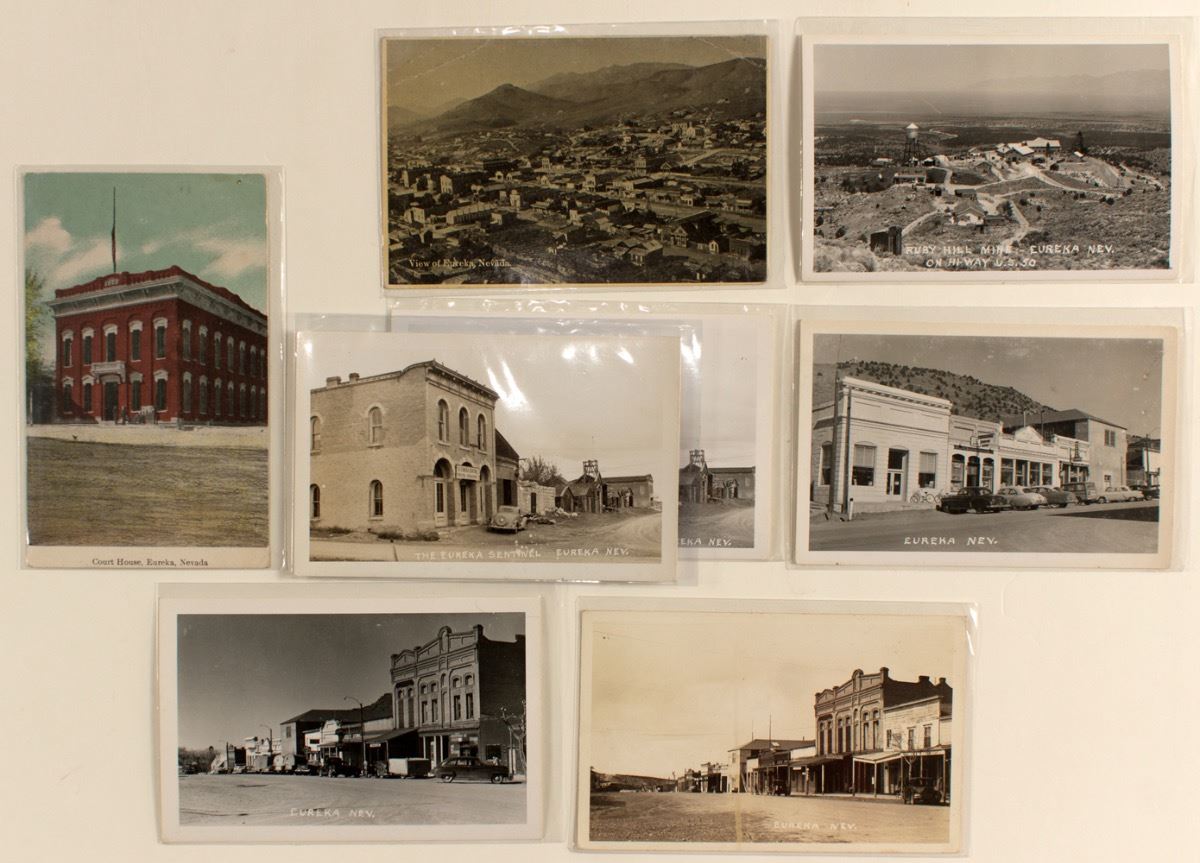 Eight cards. Ruby Hill mine, Court House, Eueka Sentinal, Overview and street scenes. (Prag collection) City: Eureka State: Nevada Date: hwac# 22933