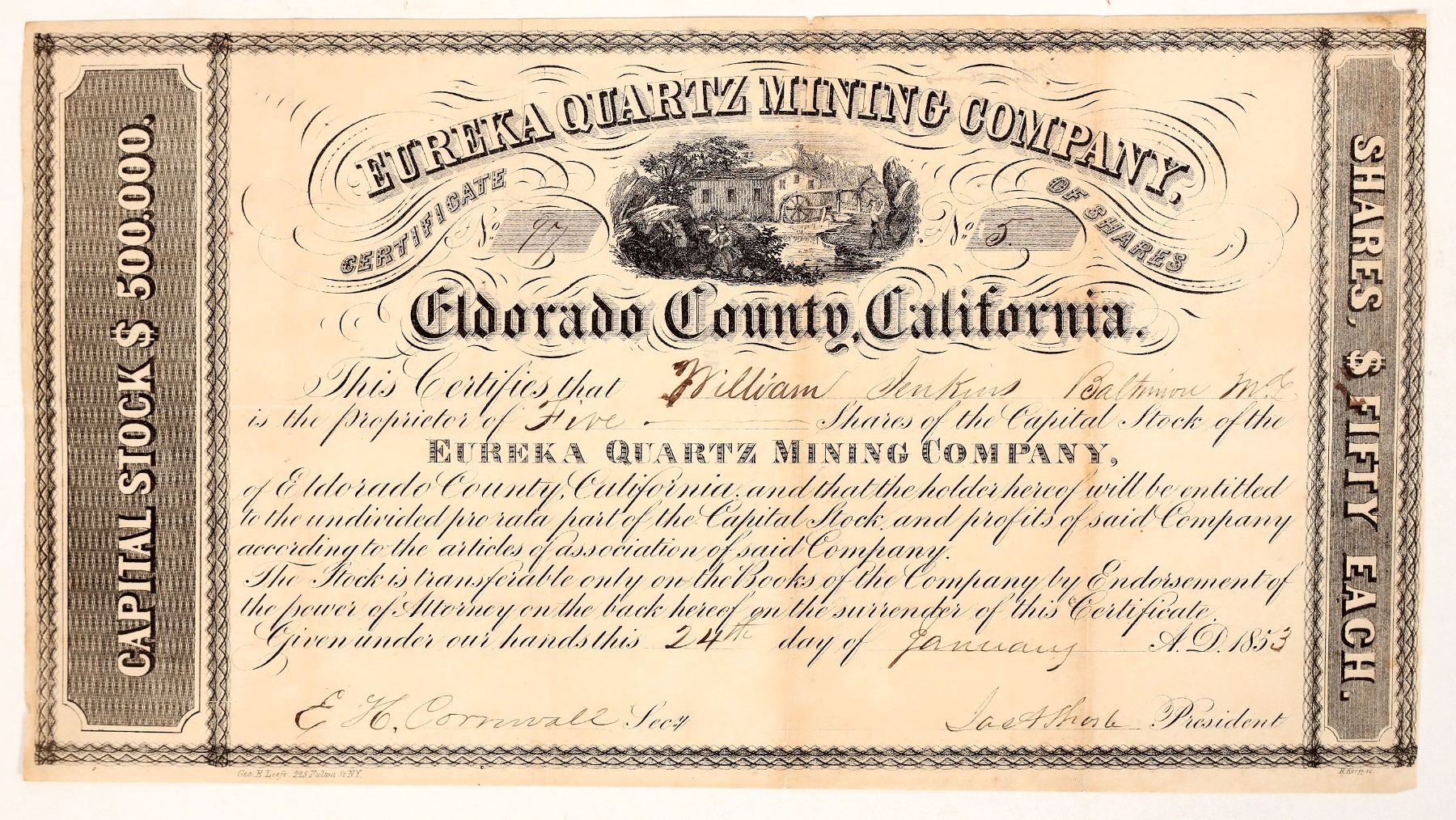 Eureka Quartz Mining Company stock certificate, No. 97, for 5 shares of capital stock. Issued to William Jenkins, dated 24 January 1853. Signed by E.H. Cornwall, secretary, and James A. Shorb, president. Measures 11" x 6". Vignette of mill and miners top center. Uncancelled. VF. The Eureka Quartz Mining Company was likely operating in Georgetown, California. There was a second Eureka Mine in Placerville, but it was not active until decades later. The Eureka quartz mine at Georgetown had a 130-foot deep shaft in 1867. It was located immediately north of the Woodside on the same quartz vein, which was about two feet wide. They had a steam hoist, but no mill. The vein had a NE-SW strike and easterly dip averaging about $30 per ton, according to J. Ross Browne in Mineral Resources West of the Rocky Mountains, 1868. By 1882, the mine was 230 feet deep, inactive, and full of water, according to the History of El Dorado County, 1883. This is quite possibly the earliest known lode mining company stock certificate extant. Condition is excellent other than a bit of verso toning on 2 creases.