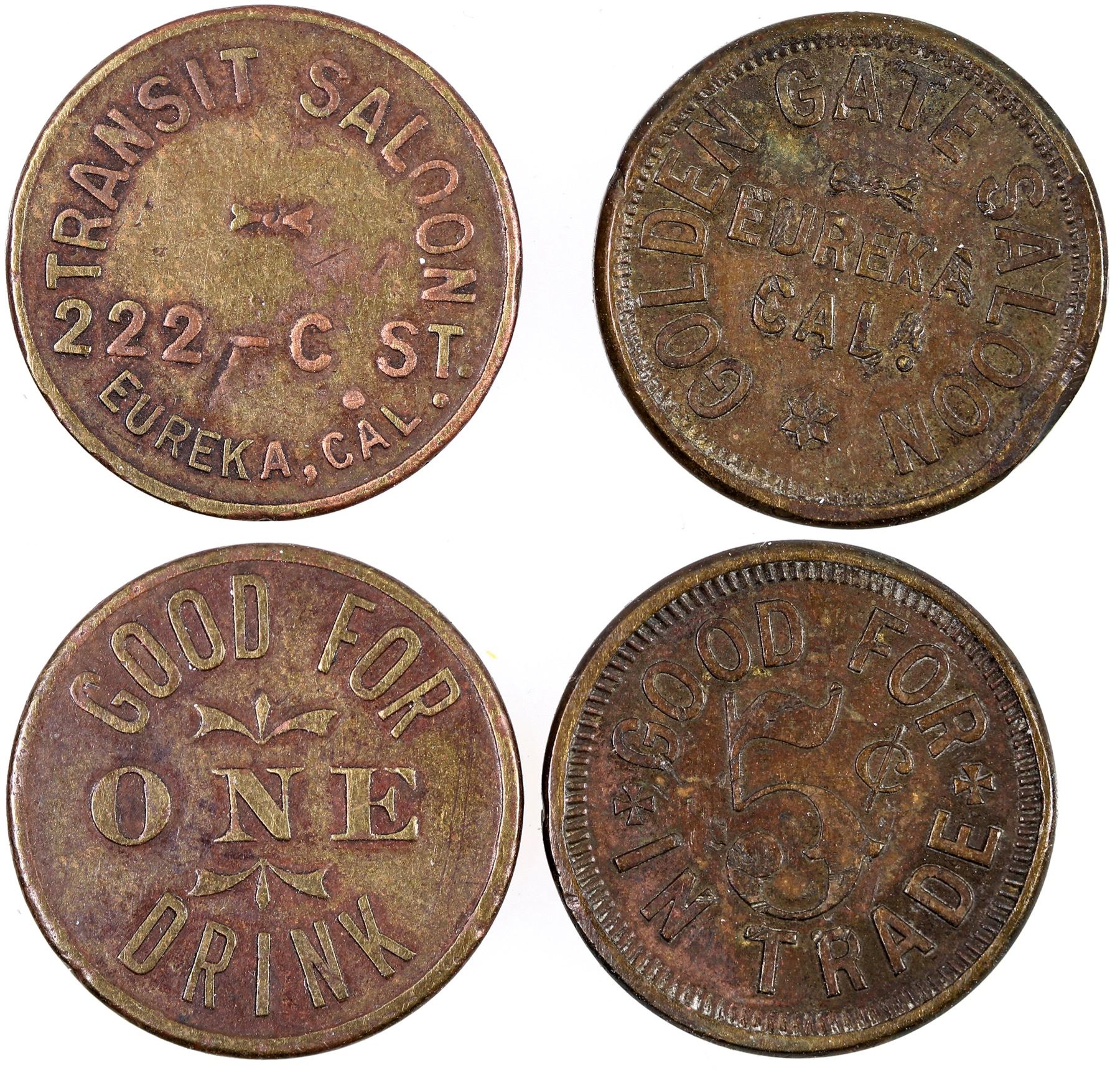 Lot of two: 1) TRANSIT SALOON / 222 C ST. / EUREKA, CAL. //GOOD FOR / ONE / DRINK; Br., rd., 21 mm. 2) GOLDEN GATE SALOON / EUREKA / CALA // GOOD FOR / 5¢ / IN TRADE; Br., rd., 21 mm.