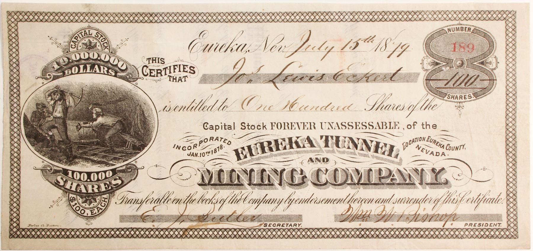 Incorporated Jan 10, 1878 State of Nevada. Cert #189 for 100 shares @ $100 per share of common stock issued to Jos. Lewis Eckert July 15,1879 signed by Wm W Bishop president, one assessment stamp on the back, black border vignette on left side of three miners in tunnel :one pushing cart, on with a pick axe and one with a rod. "FOREVER UNASSESSABLE" printed on front. Overall good condition, some small wrinkles. In protective plastic sleeve. State: Nevada City: Eureka Date: HWAC# 84606
