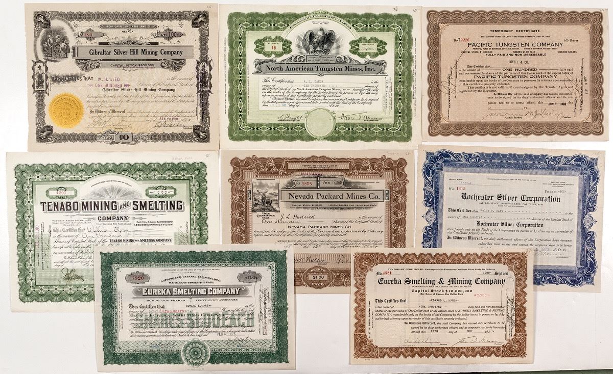 1) Nevada Packard Mines Co., 1912; 2) North American Tungsten Mines, Inc., 1952; 3) Pacific Tungsten Company, 1918; 4) Rochester Silver Corporation, 1920; 5) Gibraltar Silver Hill Mining Company, 1920; 6) Tenabo Mining and Smelting Company, 1910; 7) Eureka Smelting & Mining Company, 1923. 8) Eureka Smelting Company, 1925. (Prag Collection) City: State: Nevada Date: ID# 31535