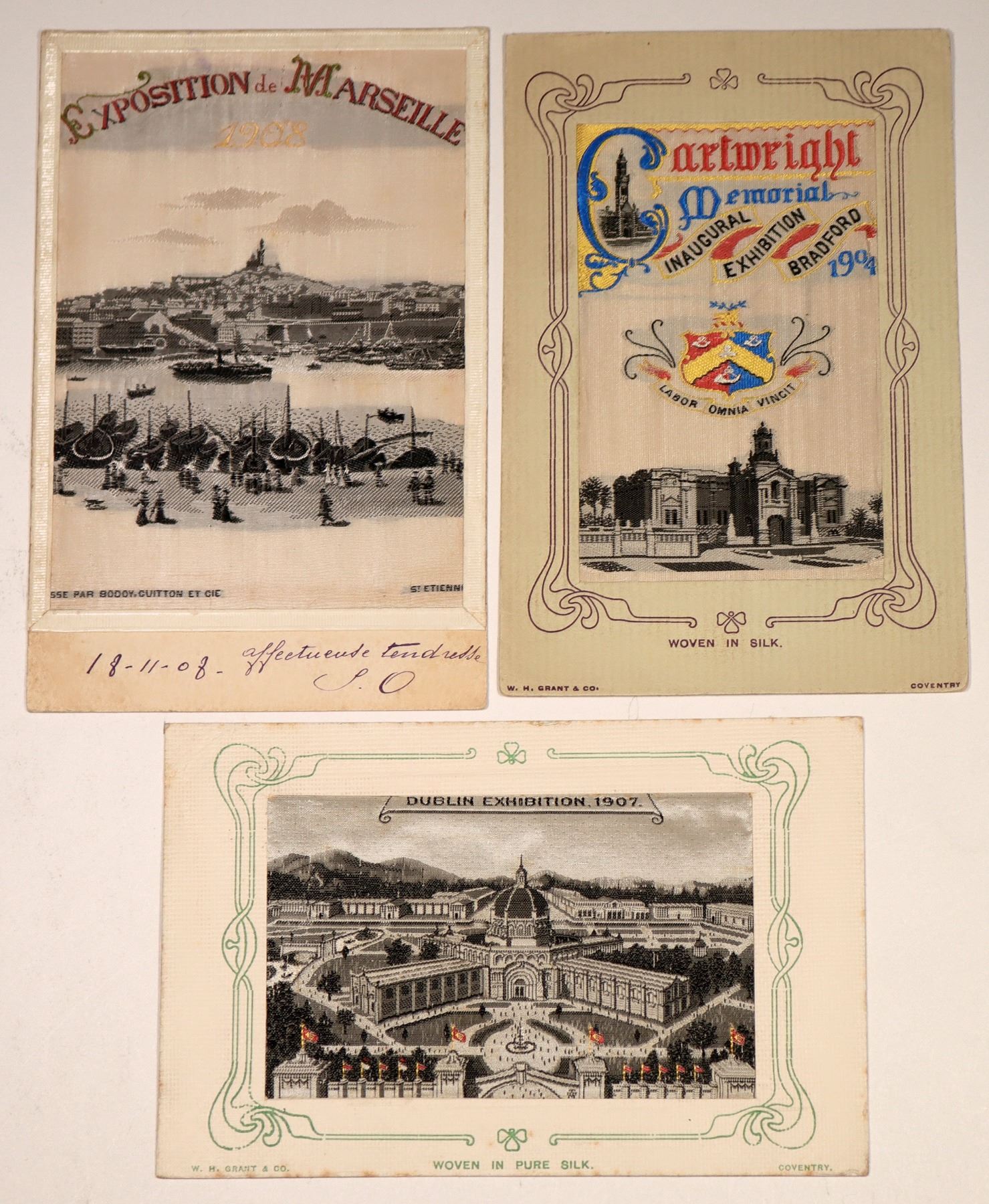 Three silk woven postcards, each featuring an exhibition theme. Included are one for Marseille. the Dublin Exhibition and The Cartwrght Exhibition in England. All have been used, but they still look good. Please see photos for more details.[ Europe