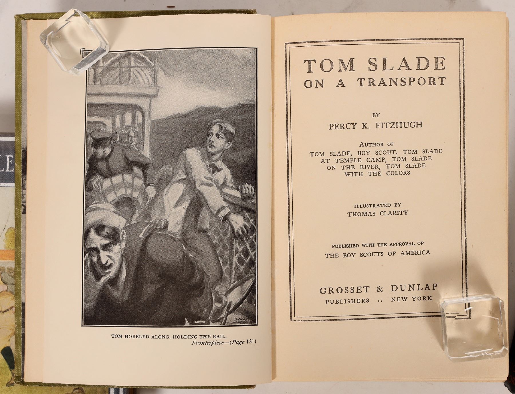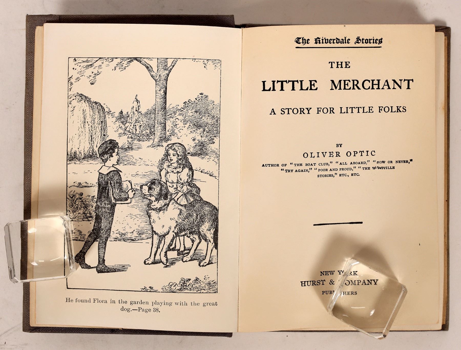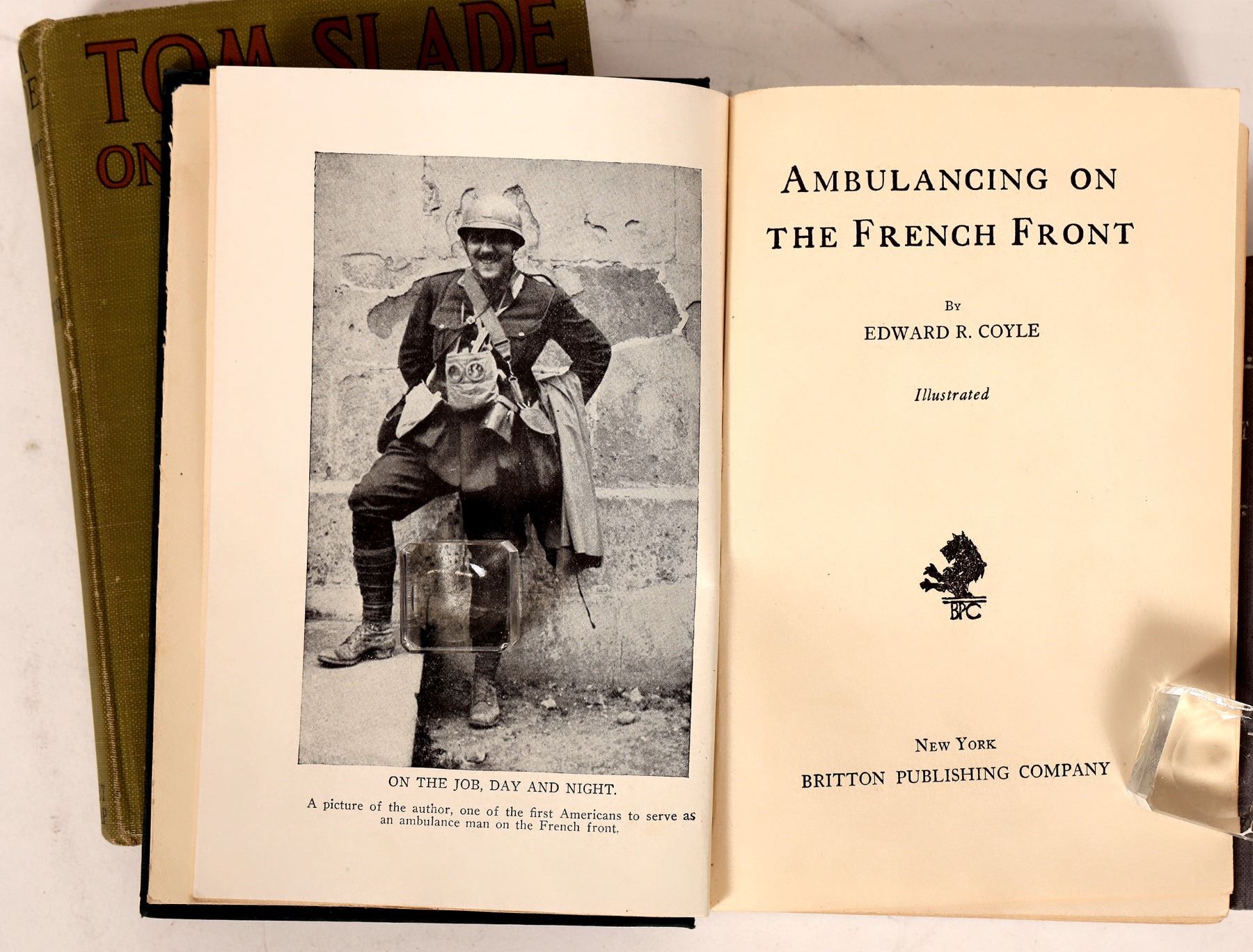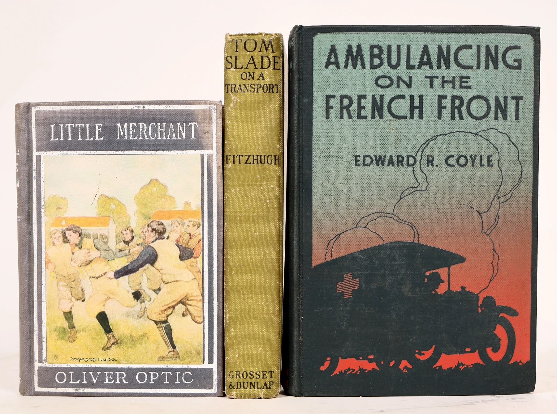 Lot of 3 books written in 1863 & 1918, "Little Merchant" by Oliver Optic is a small hardcover book with collectable art on the cover complete with illustrations throughout. Has some sun aging on the front cover & spine. "Ambulancing on the French Front" by Edward R. Coyle, hardcover book with photographs, some wear on cover overall good condition. "Tom Slade on a Transport" by Percy K. Fitzhugh hardcover book with photographs, some wear to spine & edges. [