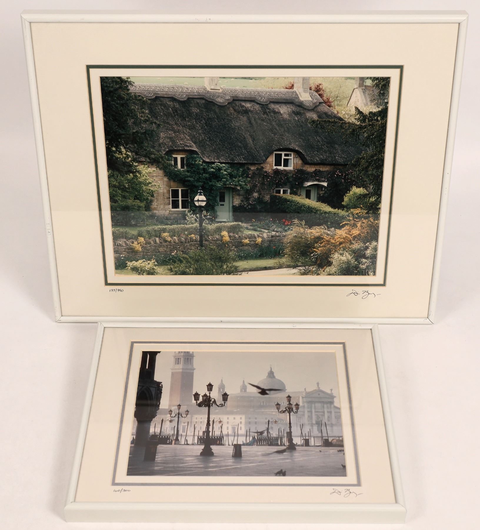 2 framed photos by Dennis Barloga. "Dennis has made his living making photographs since the early 1970s. He is best known for his unmatched portfolio of color photographs that depict old world Europe." from barlogastudios.com. Piazza Venice, 1989, #116/300, frame 11x14". Rose Cottages II, England, 1992, #133/750, frame 16x20". Both signed by photographer.