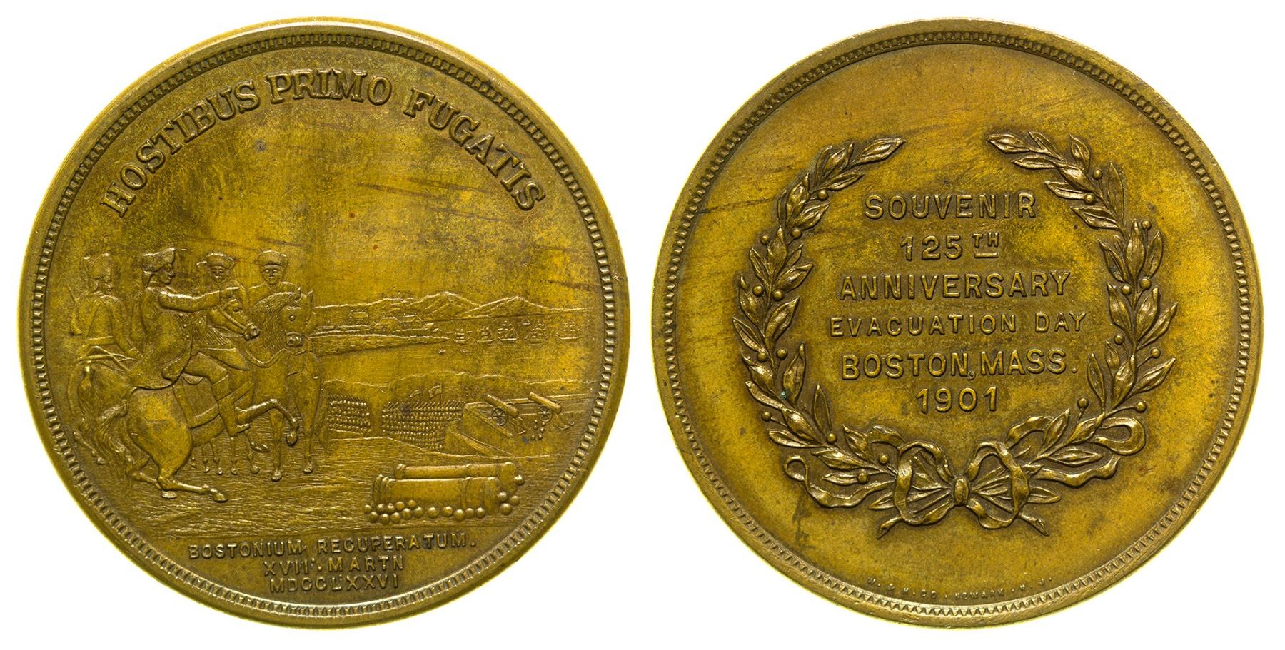 125th Anniversary of the evacuation of Boston. Struck by Whitehead and Hoag, Newark, NJ and distributed to Boston school children in 1901. Coppr, 38mm, R2. HWAC# 51346 Date: 1901 Location: Boston, Massachusetts