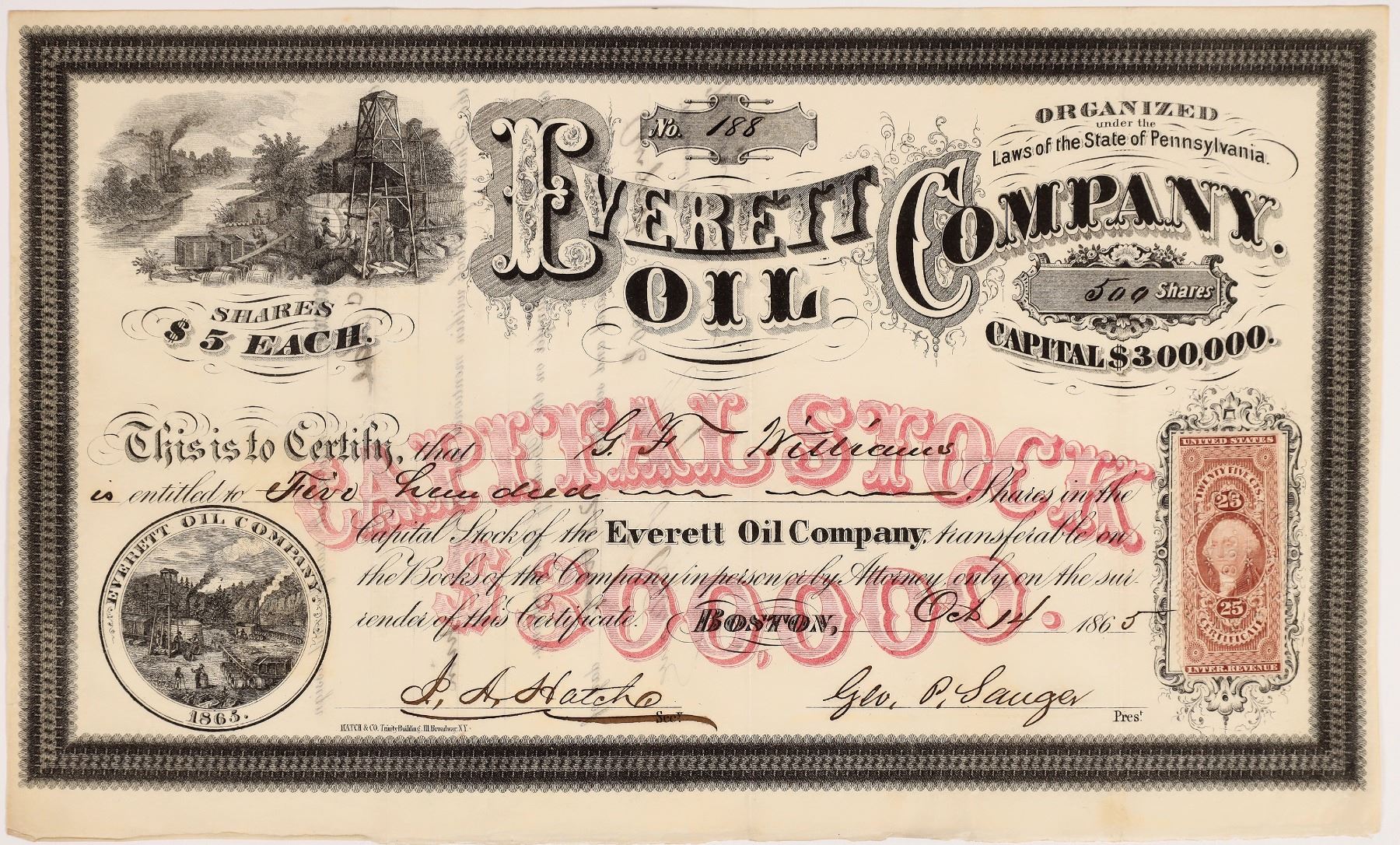 Organized in Pennsylvania. No. 188, issued for 500 shares to GF Williams in Boston in 1865. Signed by president Geo. P. Sanger and secretary Hatch. Not cancelled. Black border and fancy script title. Pink underprint. Rare pictorial seal in the bottom left, and oil derrick vignette at upper left. Printed by Hatch & Co., NY. 6.75 x 10.75" Folds, wear to edges. Very nice looking! According to a company prospectus, their "Property Embraces Two Hundred Acres, in Fee Simple, on Oil Creek, Crawford County, Penn., and Two Leases on the Clapp & Farrell Farms, in Venango County."
