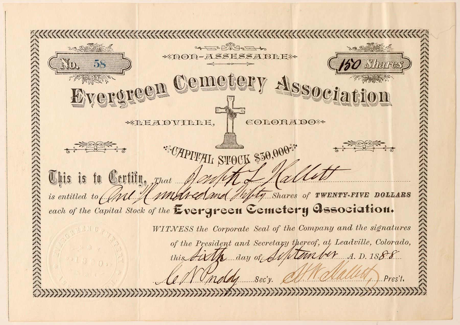 Leadville, Colorado. No. 58, issued for 150 shares to Joseph L. Hallett on Sept. 6th, 1888 in Leadville. Signed by Henry Watson Hallett, president, and Charles N. Priddy, secretary. Not cancelled. Black border and print. Small vignette of cross tombstone with flower wreath. No printer listed. 6.5 x 9.25" Folds and a large crease. Inc. in 1879. They bought and fenced a 134 acre plot of ground over Capitol Hill, NW of town. The association ended in 1899 but the cemetery is still there and in use. Hallett worked as an undertaker in Colorado Springs and Leadville before heading to Cripple Creek and engaging in mining. He developed an electrical process for washing flour gold from placer mines. Priddy was also supt. of the Leadville Water Company. **Please also see our other CO cemetery stocks in this sale. () Ken Prag Collection