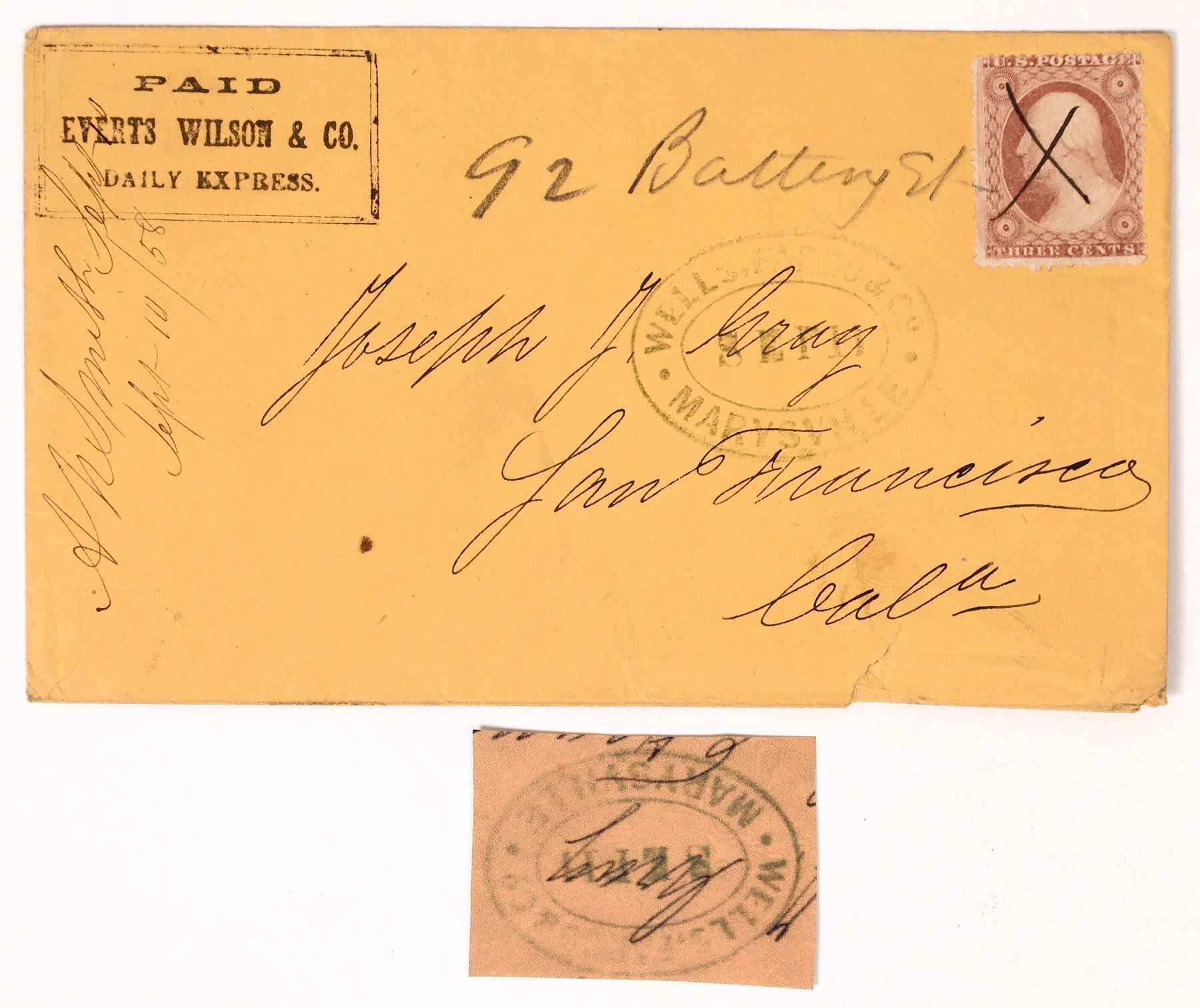 Paid Everts Wilson & Co. Daily Express frank. Marysville hand stamp and a manuscript cancel. Three cent dull red 0026 stamp. Small cover tear. Mailed Sept. 11. Everts & Wilson ran from Sep, 1856 to Sep, 1862. Frank Darwin Everts, James St. Clair Wilson, and Henry Everts formed Everts, Wilson & Co. They operated daily from Rabbit Town (which became La Porte in Oct, 1857) and served the same areas as the predecessor companies. They operated to and from Marysville and connecting with Pacific Express until 1857 and with Wells Fargo thereafter. (Western Cover Society)