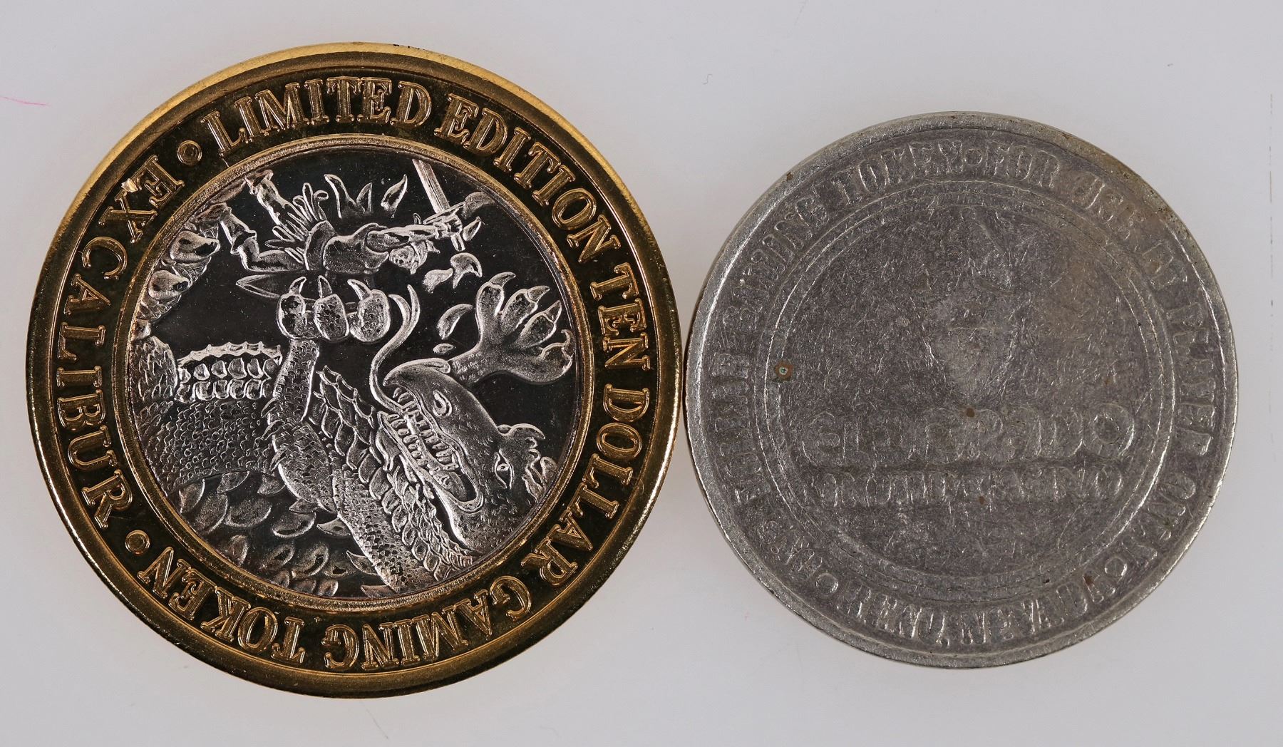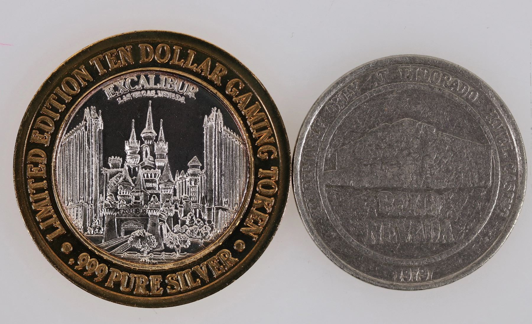 Lot of two Nevada gaming tokens: 1) Limited Edition ten dollar gaming token; .999 pure silver inner core, brass outer ring; plastic case cracked; 2) 1979 El Dorado one dollar gaming token.