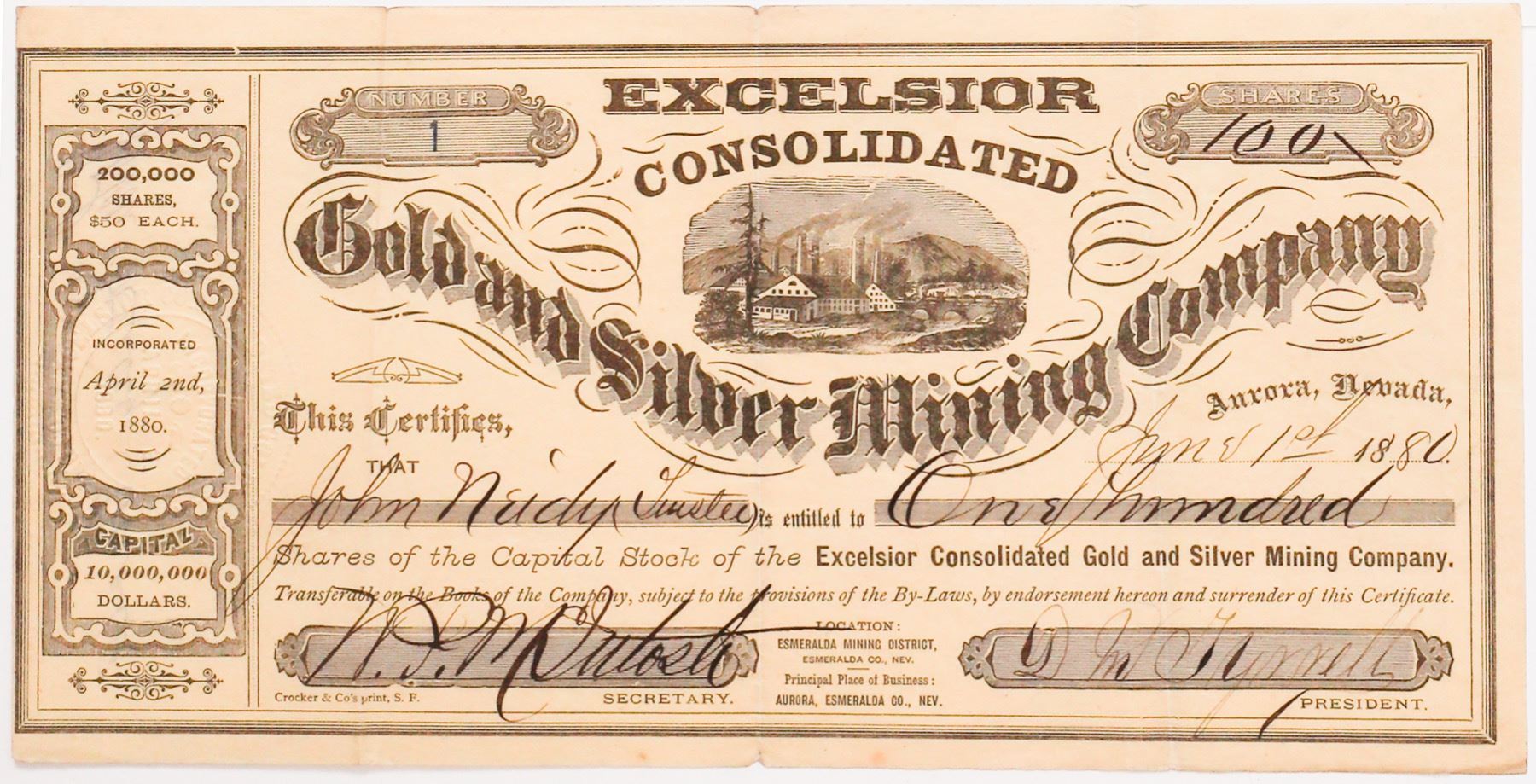 This certificate is steeped in Aurora and Nevada history! First of all it stock certificate NUMBER 1. Second it is Aurora 1880. Third it is signed by John Neidy (Aurora's longest resident and owner of the Neidy brick building on Pine Street), Waddy McIntosh (Aurora miner) and D. M. Tyrrell (superintendent of the Overman, Belcher, Yellow Jacket, Meadow Valley, Richmond & Ely and Aurora properties). Issued for 100 shares to John Neidy trustee (endorsed on back by Neidy). Signed by W. P. McIntosh and president D. M. Tyrrell. Dateline Aurora June 1, 1880. Incorporated April 2, 1880. Not cancelled. Mining buildings vignette. Crocker & Co. of San Francisco. printer. Location of mines: Esmeralda Mining District, Esmeralda Co., Nev. Principal place of business: Aurora, Esmeralda Co., Nev. Folds with small tears at edges. Overall nice. The only information I found on this mine was on the certificate. It may have been sold in 1881 by Mitchell for a large sum of money? Biographical information on the three Aurora citizens is included.