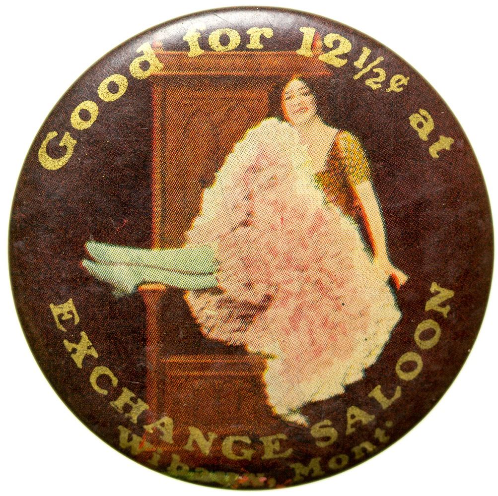 R-11. Nice image on face of woman in pink ruffled petticoat balanced on a chair, 1.75" diameter. GF 12 1/2c at / Exchange Saloon / Wibaux, Mont. Very good condition, mirror a bit worn. (Svoboda Collection) City: Wibaux State: Montana Date: HWAC# 33869
