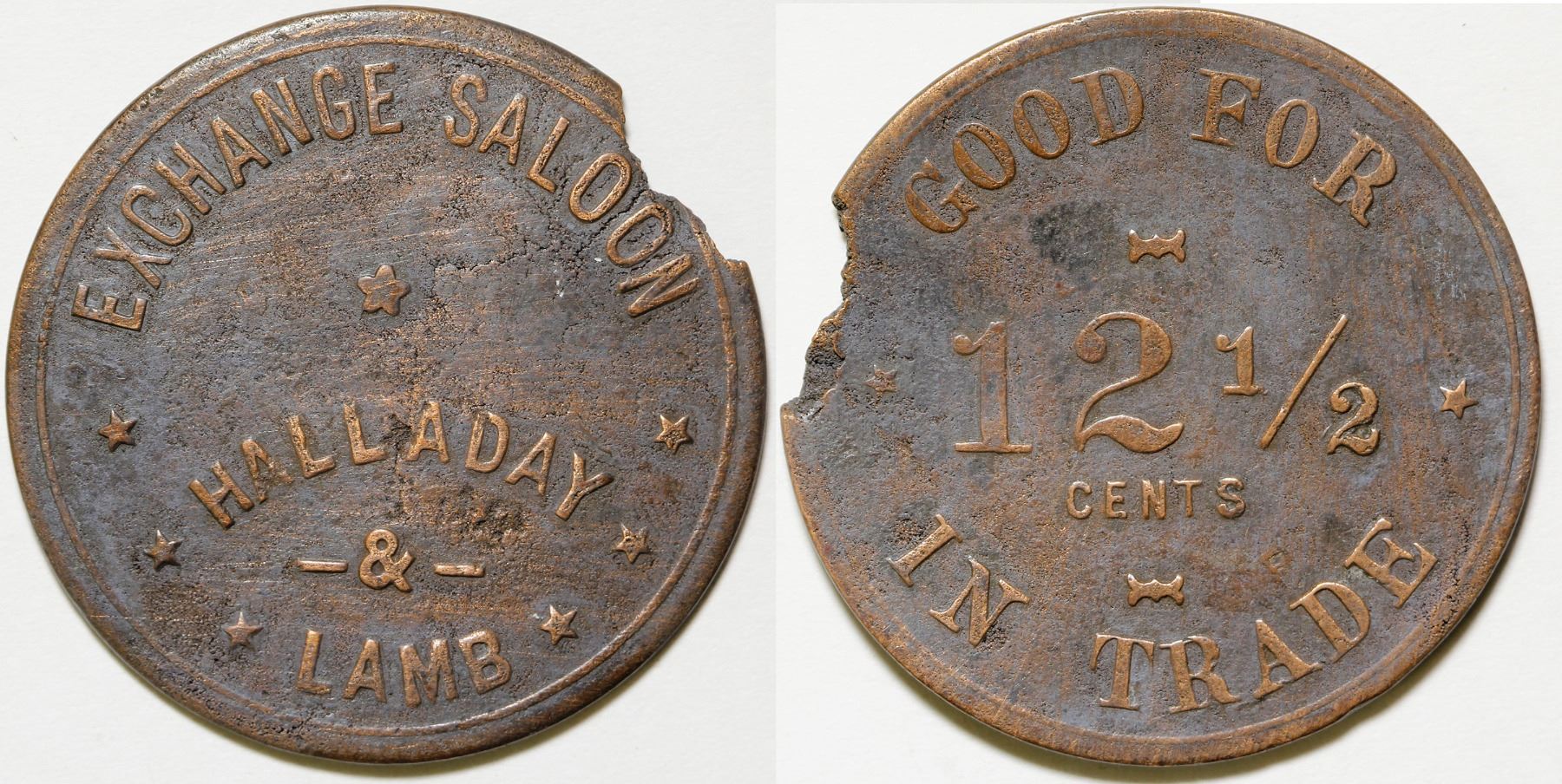 Obv.: Exchange Saloon / Halladay / & / Lamb; Rev.: Good For / 12 1/2 / Cents / In Trade. Br. rd., 34 mm. Bite taken out of a corner.
