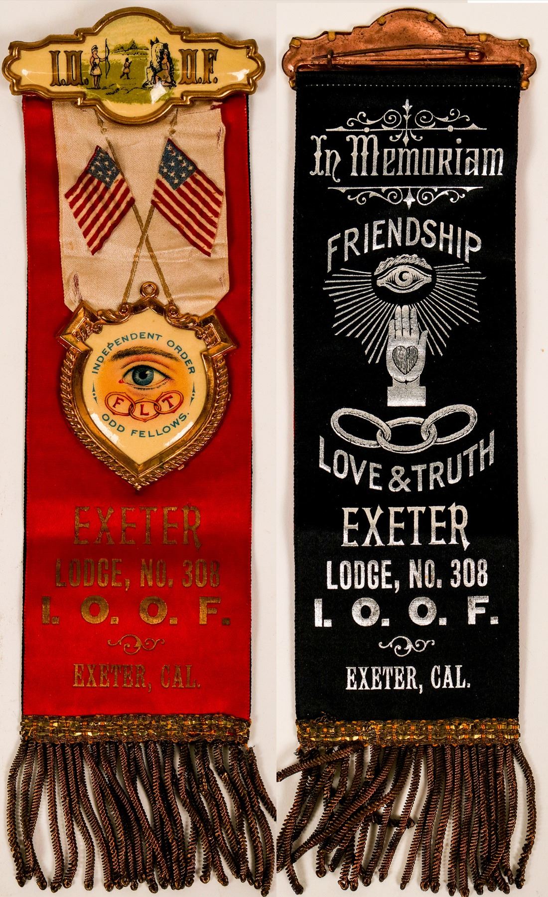 This is a membership ribbon for the Independent Order of Odd Fellows in Exeter, California.
