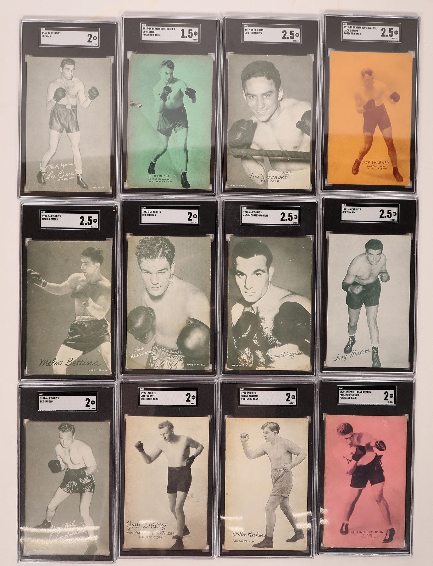 Boxer Exhibit brand sport cards that have a low grading because of a small pencil mark on the reverse of each one. They are basically in mint condition, save for an eraser so, don't let the low grading from Sportscard Guaranty LLC fool you.This is a group of twelve (12) Heavyweight & Light Heavyweight fighters from the 1920s to the 1950s. They include: Lee Oma heavyweight contender had a career stretching for 1939 until 1951 He was inactive in 1942, suspended for inept performances, usually from being drunk.