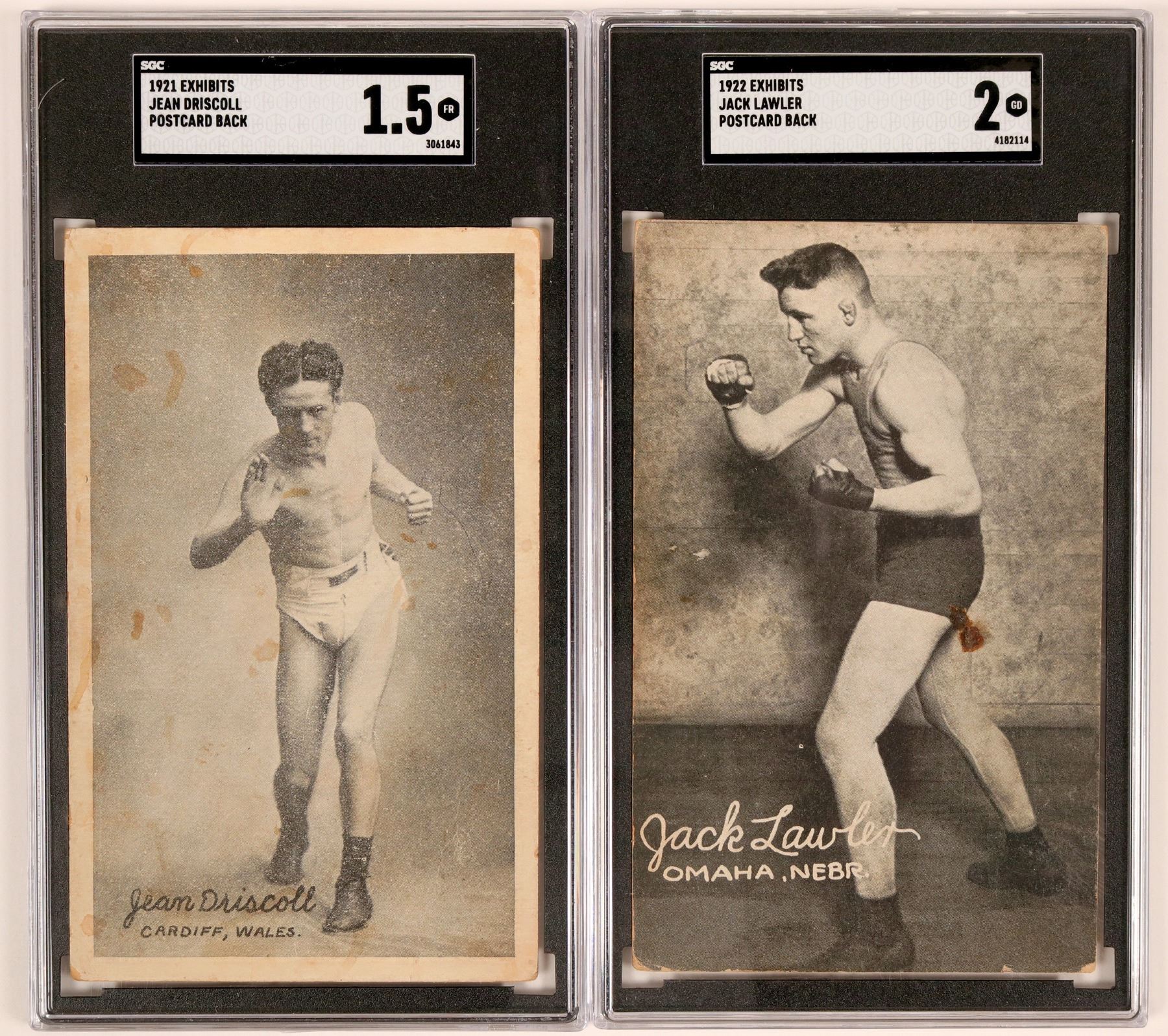 This is a a duo of Exhibits 1922 cards featuring Featherweight Jean Driscoll and Lightweight Jack Lawler, known as "The Omaha Kid." Cards are in good condition. See photos for more detail.