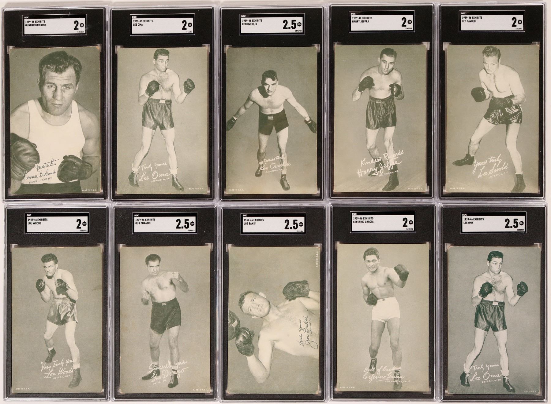 A group of Exhibit Series 1939-46 boxer cards. Included in this set areLou Woods, Gus Dorazo, Joe Baker, Ceferino Garcia, Lee Oma, Lee Savold, Harry Jeffry, Ken Overlin and Gunnar Barlund. Cards are in good condition. See photos for more details.