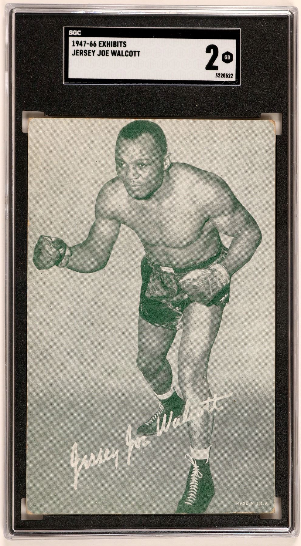 This is an Exhibit card featuring former Heavyweight World Champion Jerry Joe Walcott. He held the title in 1951-52, became a referee and eventually served as chairman of the New Jersey State Athletic Commission. Card is in good condition. See photos for more details.
