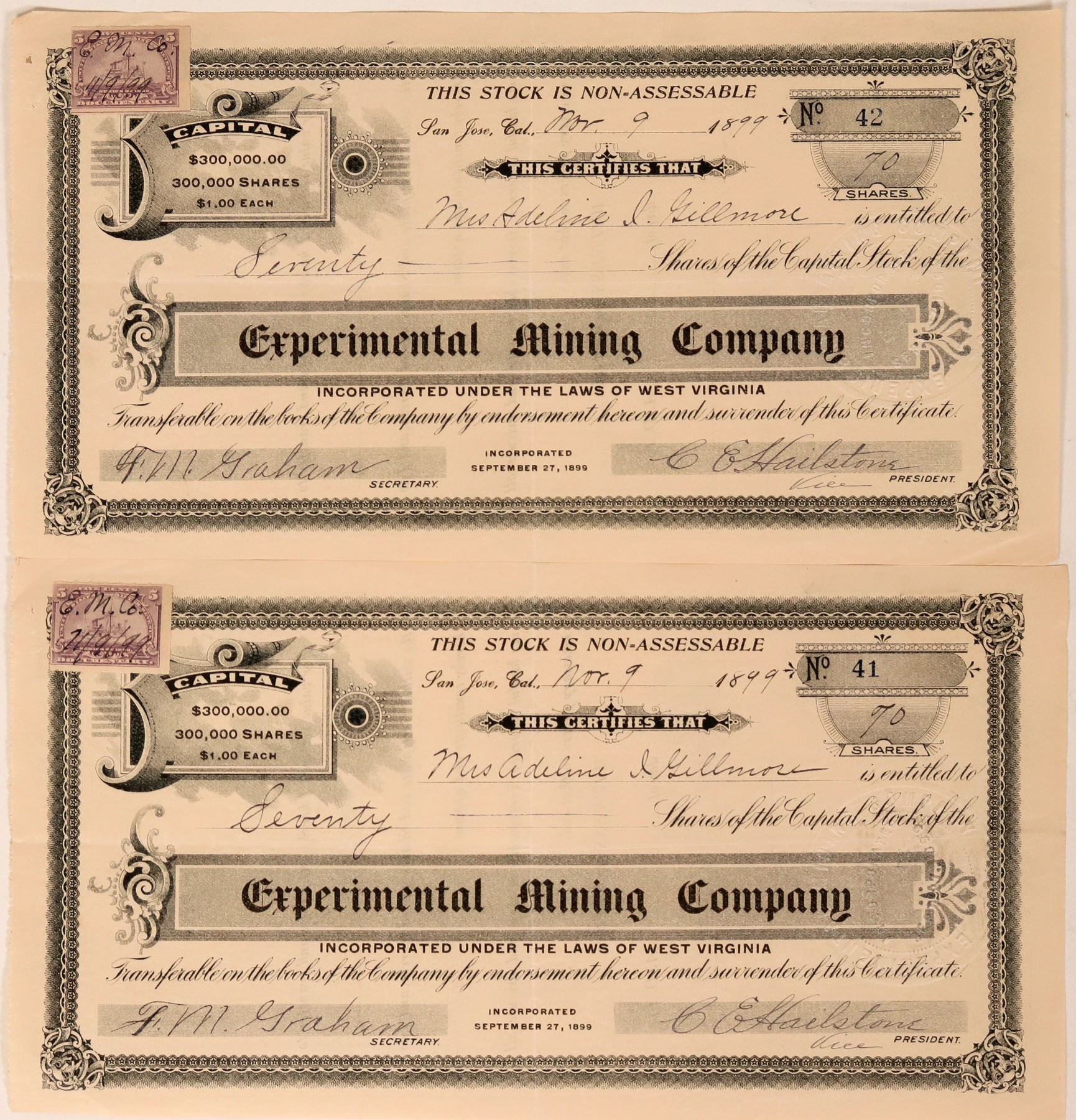 Two certificates from the Experimental Mining Company issued in 1899. Located NNW of Yankee Hill and 3.1 km (1.9 miles) NNE of Columbia, along Experimental Gulch, in the Columbia district. Mine was initially developed 1854 and worked intermittently. The certificates were issued at San Jose, California. Certificates #41 and #42 both have a 5 ct. documentary stamp at top left. Uncancelled.