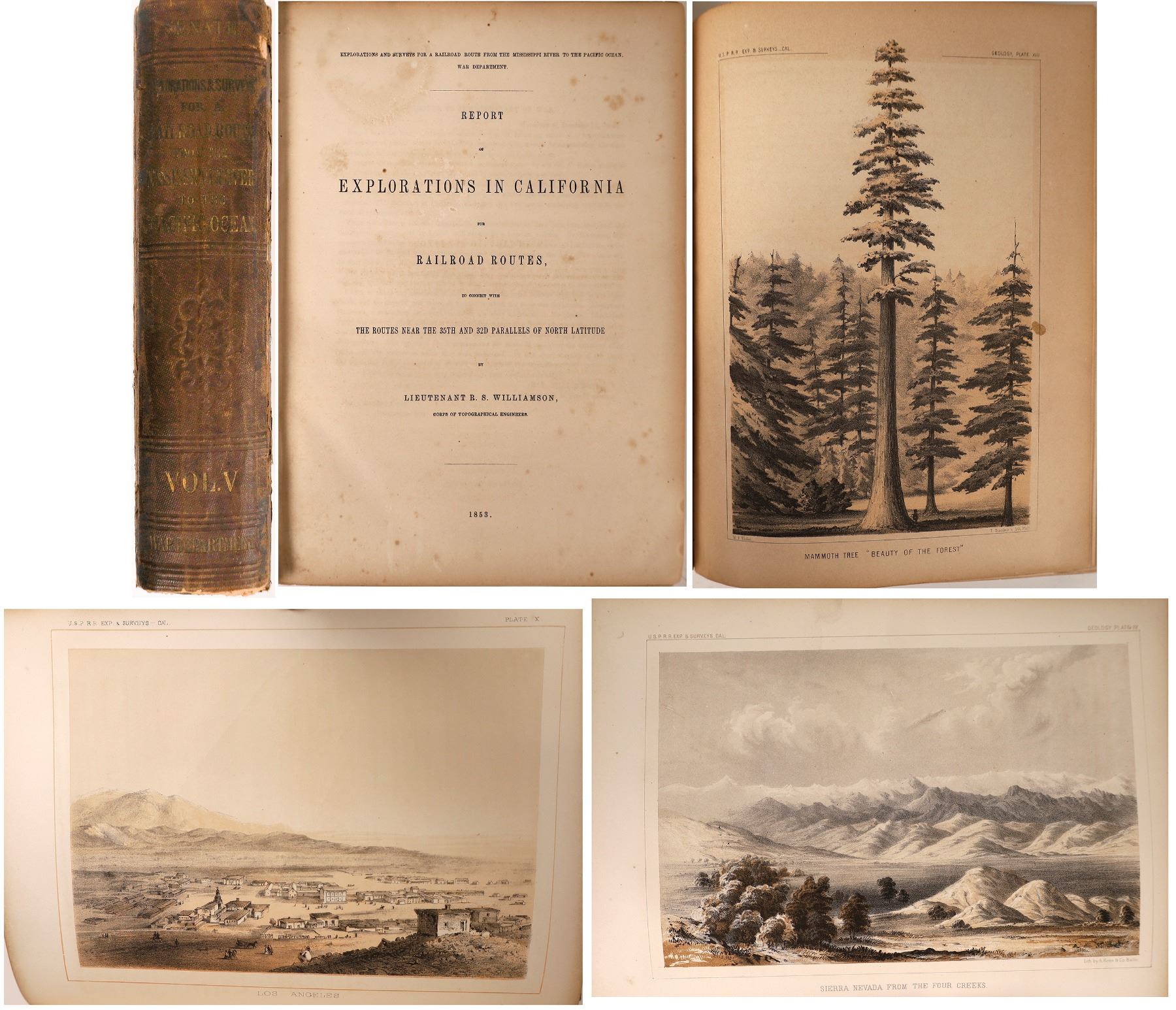 This is a very, very early work on creating a Southern transcontinental railroad route. In the early 1850s, three routes were under consideration from the United States Government for a transcontinental route: southern (this route), central (the final route chosen) and northern. There was a great deal of interest in a Southern route, which would soon lose its support with the threat of a Southern secession. Fold-out maps are attached and in good condition. Plates for plant identification also intact. Plates with sketches of the route are priceless: Los Angeles when hardly a village, Tejon Pass, the Great Basin, ancient lakes. Some discoloration with age. Binding is starting to separate, but all pages are firmly attached. 1853 / 1855. Approved by Secretary of War Jefferson Davis. Would this have changed the Civil War, if this route were chosen?