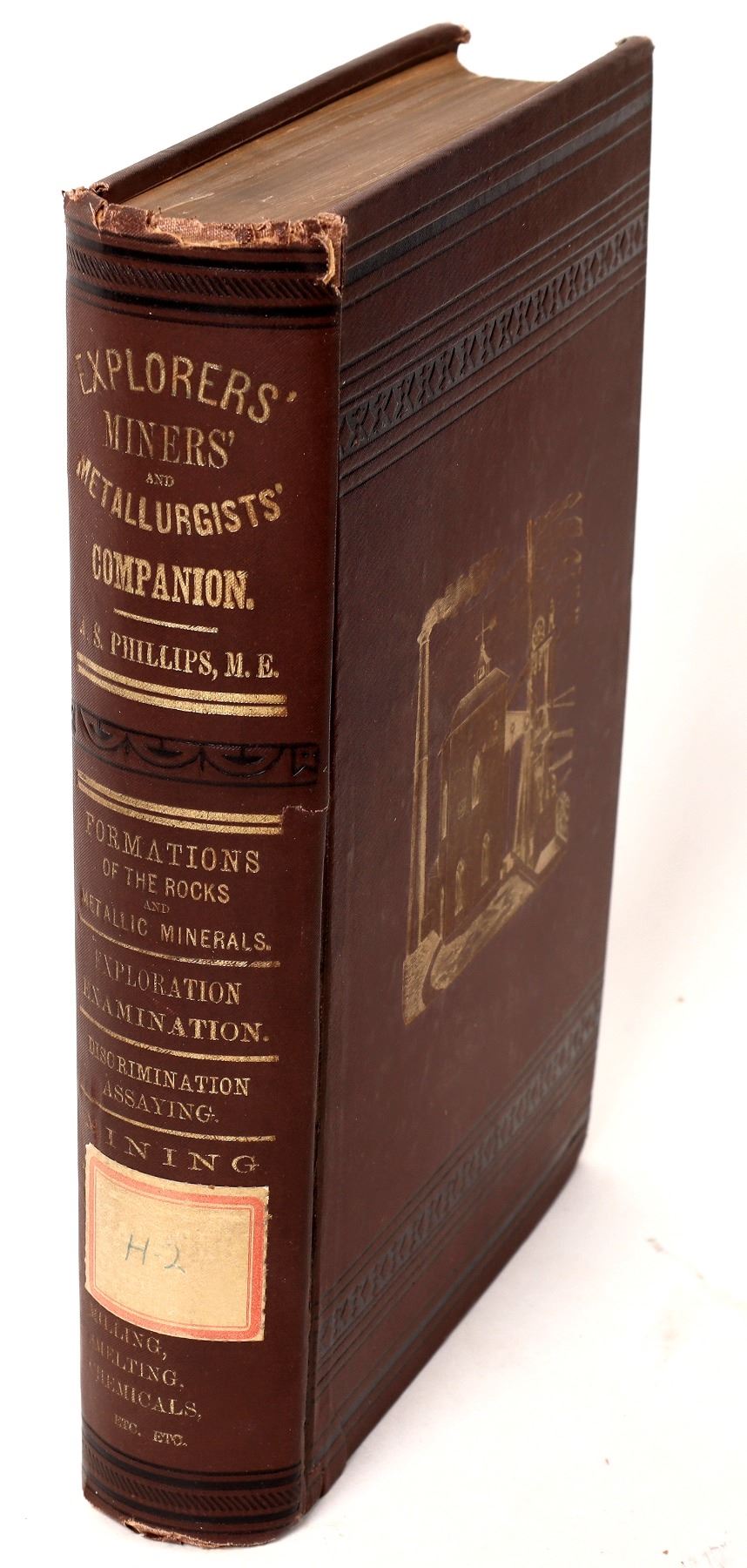 Author's copy! Explorers' and Assayers' Companion: Rocks, Veins, Testing, and Assaying: Phillips, J. S., M.E., London, Trubner & Co. 1881 Hard Cover. 3rd Edition (best). 8vo - over 7.75 x 9.75" tall. Volume I, complete in itself. Beautiful gilt pictorial drawing on front green cover. Beautiful gilt lettering on spine and gilt pictorial scene on front cover. Gilt lettering in excellent shape. light spotting on 10 percent of front board XVII chapters. 468 pp plus a Catalogue of works on Applied Science, chiefly relating to Mining, Mechanics, and Engineering; 40 figures plus illustrations & tables. Text is very clean and tight. Interior in great shape. Figures include cross section of Comstock Load, Horse whim, underground mine plans, and a great glossary (45 pages long) of words and phrases used in the arts of prospecting assaying mining and metallurgy. This is the author's copy!! Stamp says "Removed from San Francisco J.S. Phillips: E.M. No 1 Wall St, New York". cover has minor damp spotting back board edge (2 inches has board showing) otherwise a very nice copy. P-254 Franklin Collection. GO TO THE BOOKS SECTION OF THIS AUCTION FOR OTHER IMPORTANT MINING REFERENCES AND MINING-RELATED WORKS.
