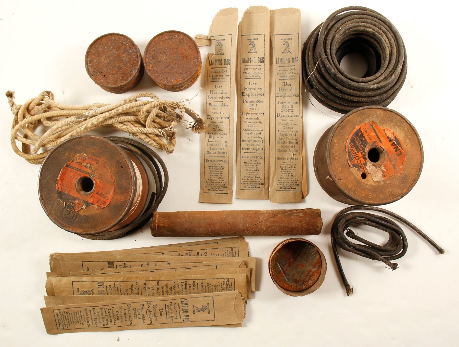 Explosives wire, fuses, tamping bags, rusty explosive tins. Perfect for a museum display. State: City: Date: