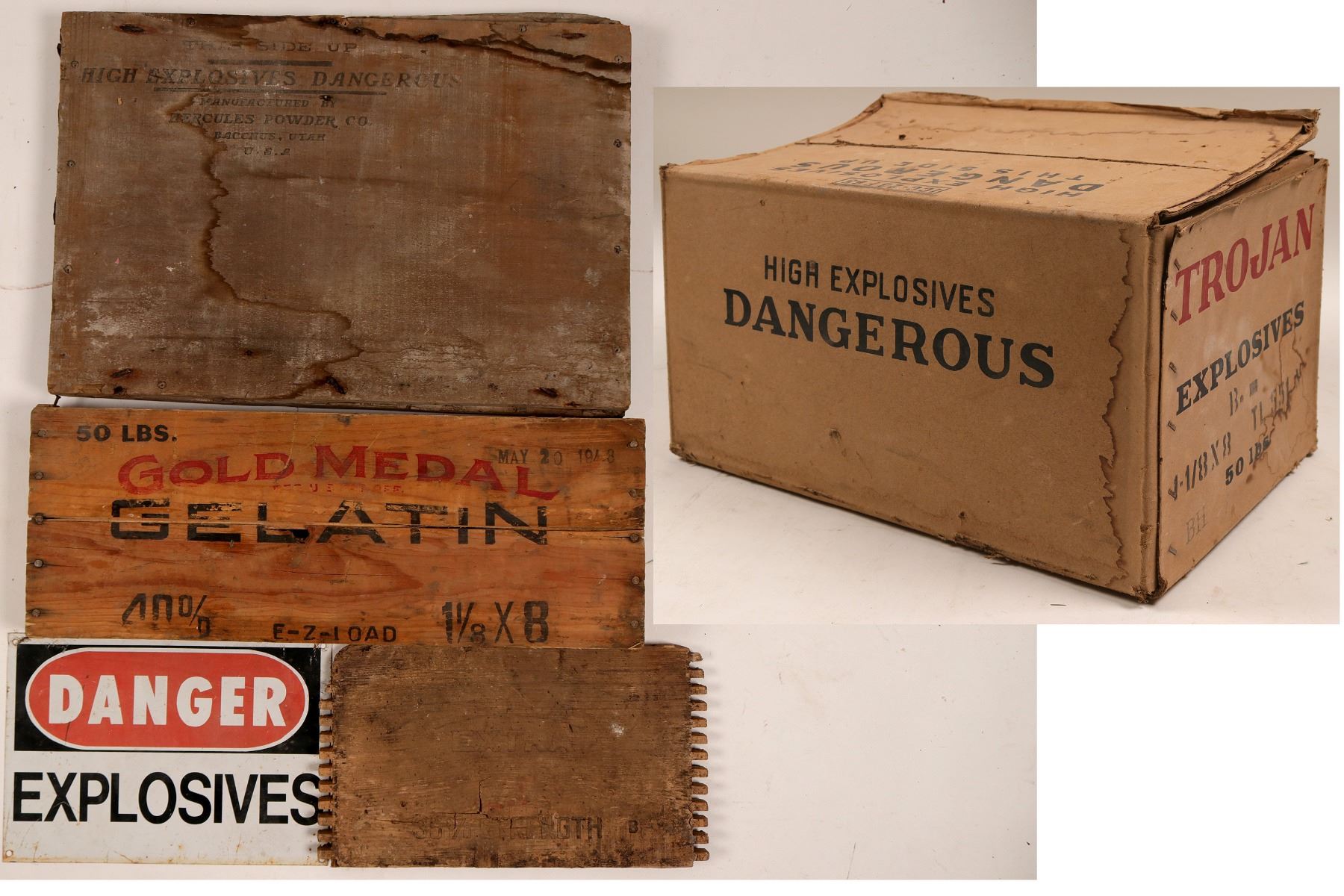 Nice varied group of explosive collectibles. a) Trojan explosives cardboard box; b)gold medal gelatin wood box end; c)Danger explosives tin sign; d)dynamite box end; f) hercules box lid with the other sie used as a sign. City: State: Date: