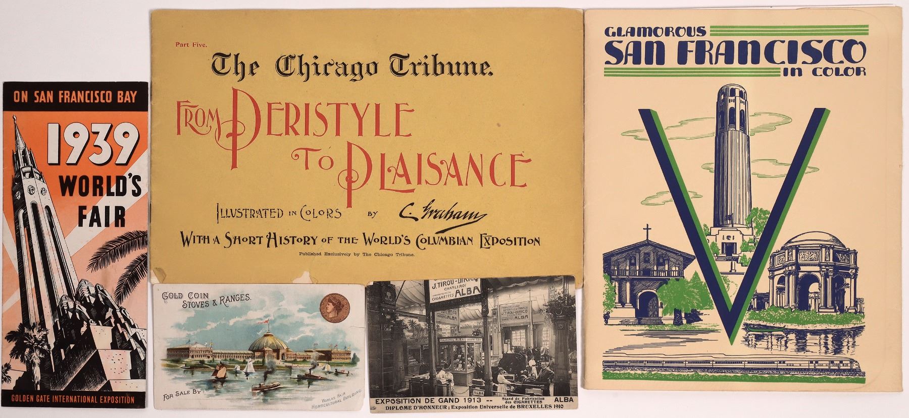 Glamorous San Francisco in Color photo set, 1939 San Francisco World's Fair pamphlet, 2 post cards, Chicago Tribune-From Peristyle to Plaisance, 1893 Expo. State: City: Date: Provenance: Stuart MacKenzie Montana Collection