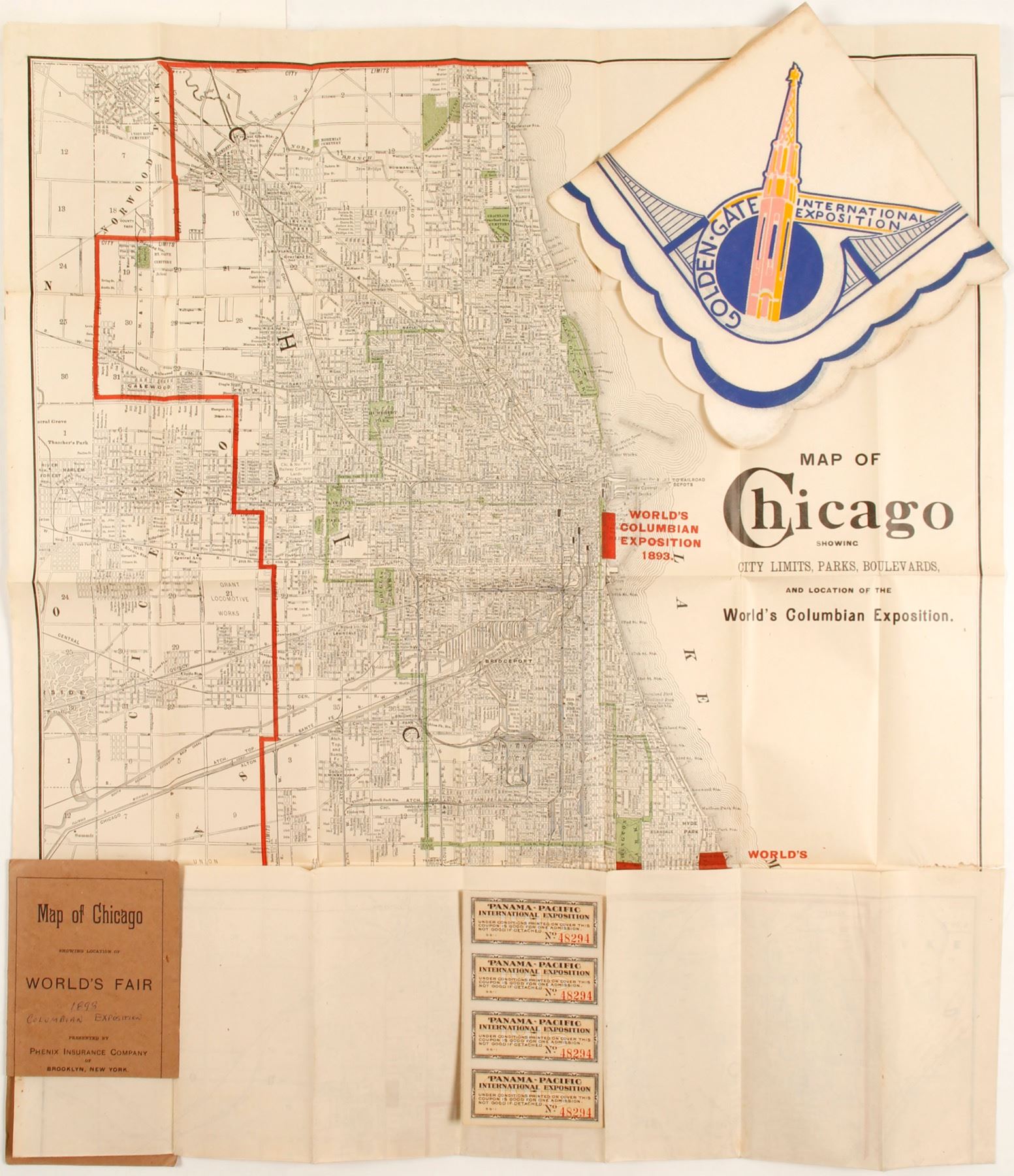 Folding map 1893 Columbian Expo in brown sleeve. 4 unused Pan Pacific Expo tickets. Golden Gate Expo color paper napkin-unused. State: City: Date: HWAC# 83328