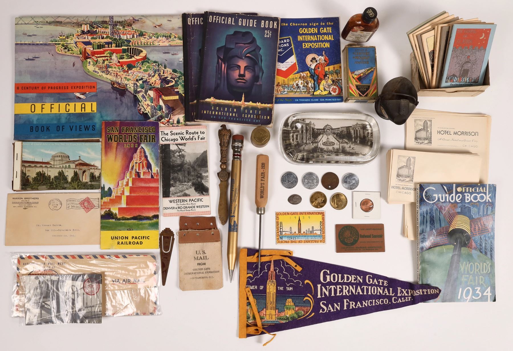 8.25" wood handle 1939 SF icepick. 1933 Chicago Official book of colored views in original mailer. About 20 1933 Hotel Morrison envelopes and letterhead. 2x 1939 San Francisco Official Guide Books. Small white metal 1939 handled pail. 1915 Pan Pacific album of views. 1934 official guide book in original mailer. 1934 empty Canadian Club bottle in partial box. 1894 brass paperweight 1x1.25". St. Louis 1904 brass figural letter opener 7.25". 1915 Pan Pacific paperweight 4x7.25" and more cool souvenirs.