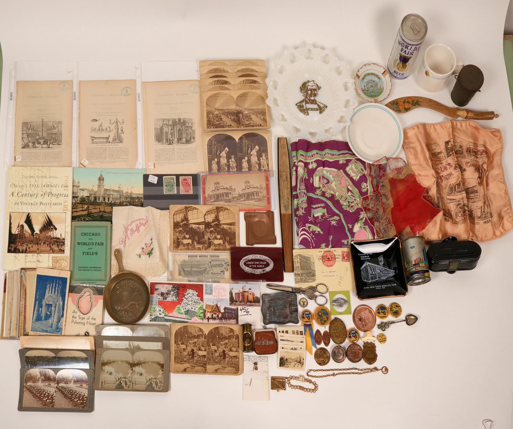 Box of exposition collectibles from the 1876 Centennial Expo on up. Plates, photos, china, metal items, a plethora of collectibles. Please see photo online. At least 30 different items.