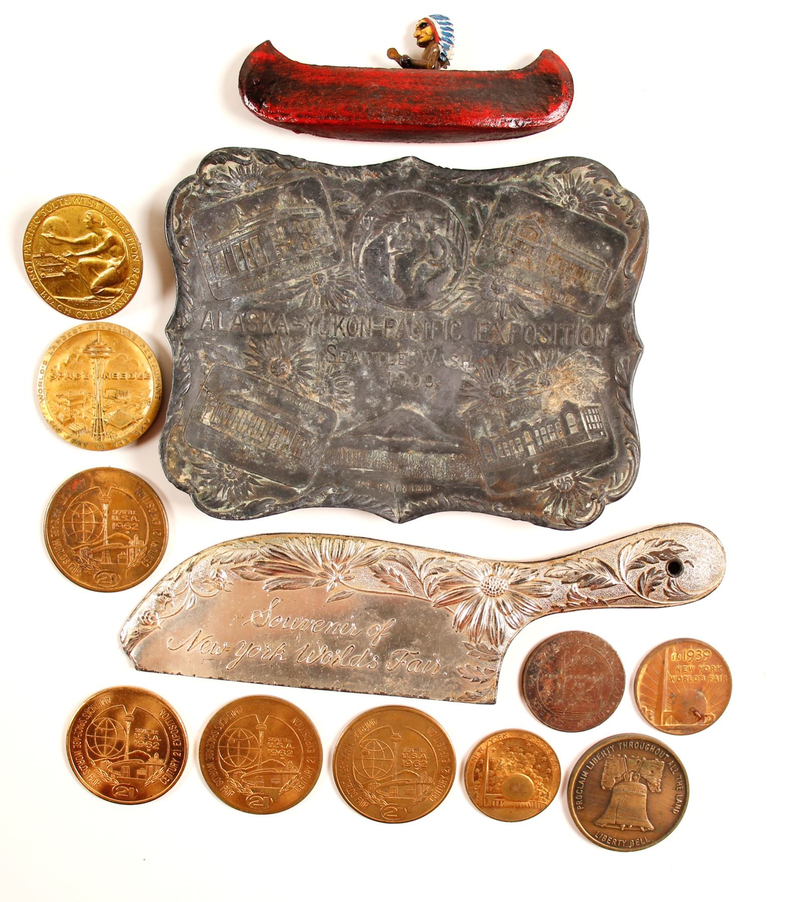 Eight medals from 1962 Seattle World's Fair; 1939 New York World's Fair. Pin from Long Beach Pacific Southwest Exposition 1928. Metal plate (7 x 5 inches) from the Alaska -Yukon- Pacific Exposition, 1909. New York World's Fair cake cutter. Wooden carved Indian in a canoe. State: City: Date: HWAC# 84749