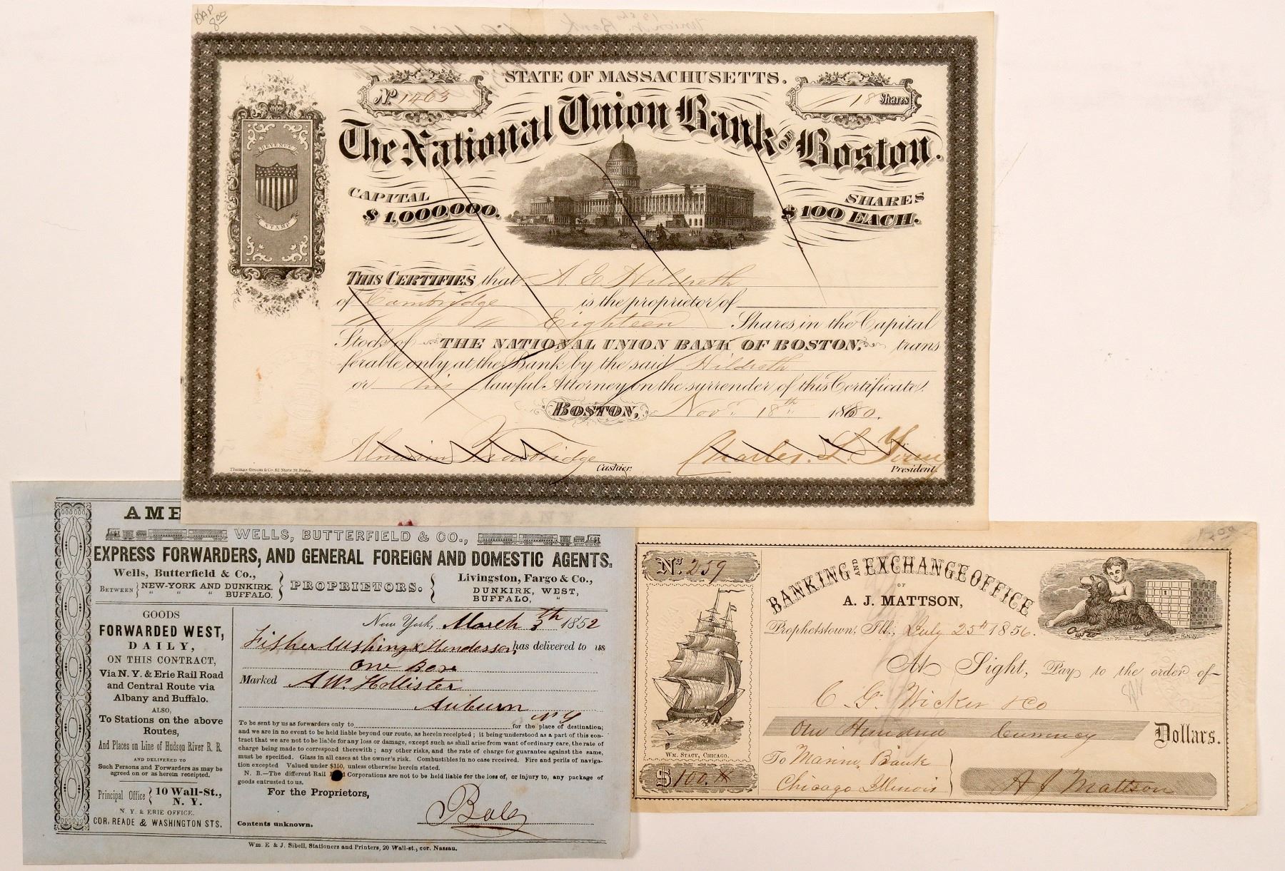 3 stock certificates: 1) $100 Banking & Exchange Office of A.J. Mattson assigned stock certificate # 259 dated July 25, 1856, raised co. seal. Vignette of sailing ship on left border and baby with dog on top right of certificate. Assigned. Printed: Wm Stacy, Chicago, 2) Cancelled American Express Co. Wells, Butterfield & Co. delivery slip dated March 3, 1852 to A.W. Hollister, Auburn, NY. Printed: Wm E & J. Sibell, Stationers and Printers, 20 Wall St, Cor. Nassau. 3) Cancelled 18 shares National Union Bank of Boston @ $100 each, dated Nov 18,1880 signed by cashier and president. Raised seal with gray border. Printed: Thomas Groom & Co. , 82 State St. Boston. Vignette of capital building on top center and revenue stamp on left top.
