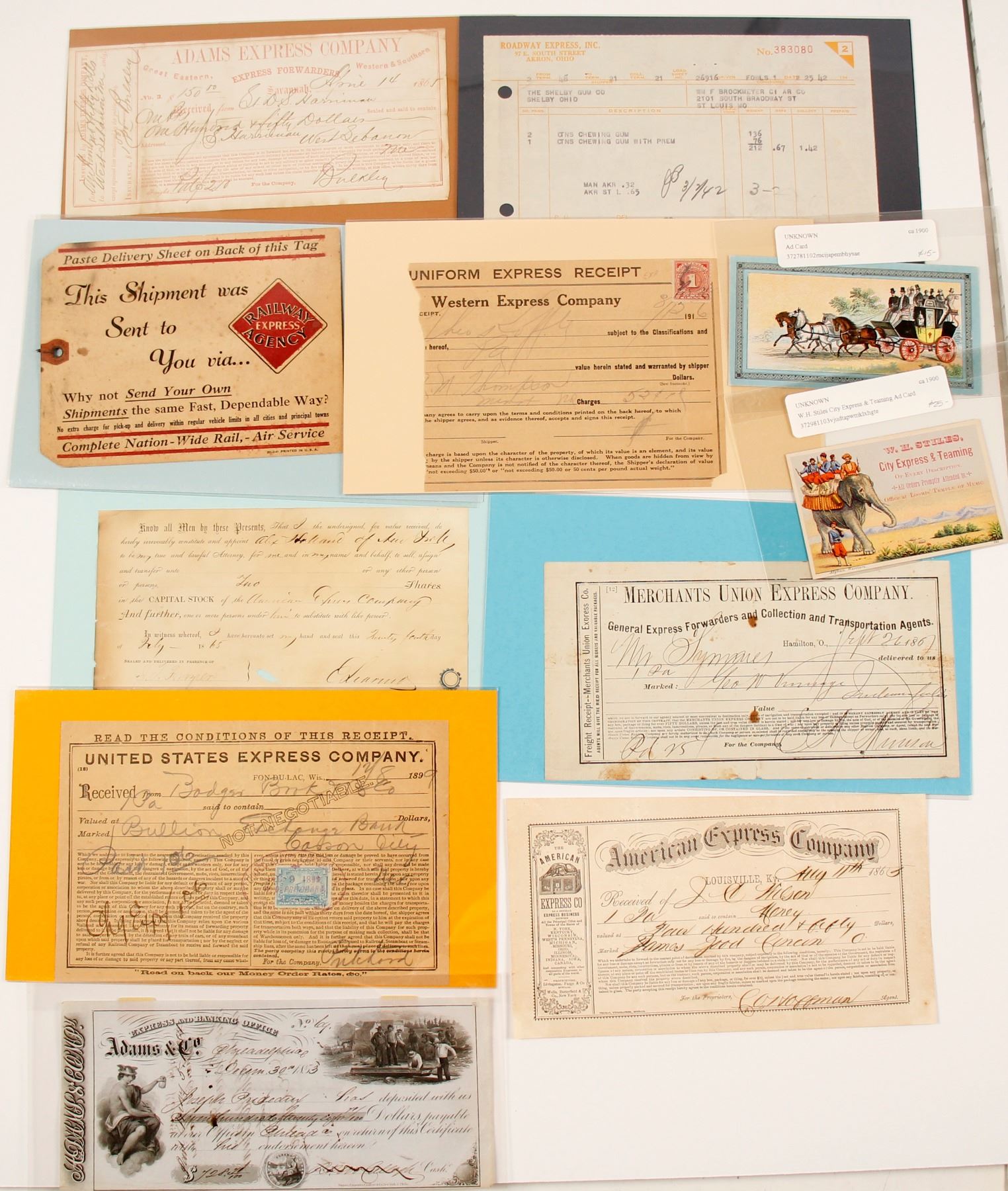 Lot of 11 from numerous express agencies. Includes: Adams & Co. COD, 1853, Philadelphia; Adams Express Co. receipt, Savannah, Georgia, 1865; American Express Co. receipt, Louisville, Kentucky, 1865 and stock transfer receipt, 1865; United States Express Co. receipt, Fon-Du-Lac, Wisconsin 1899; Merchants Union Express Co. receipt, Hamilton, Ohio, 1867; Western Express Co. receipt, 1916; 1942 Roadway Express Inc. receipt; Railway Express Company shipment tag; advertising card for WH Stiles City Express & Teaming; and color ad card showing stagecoach.