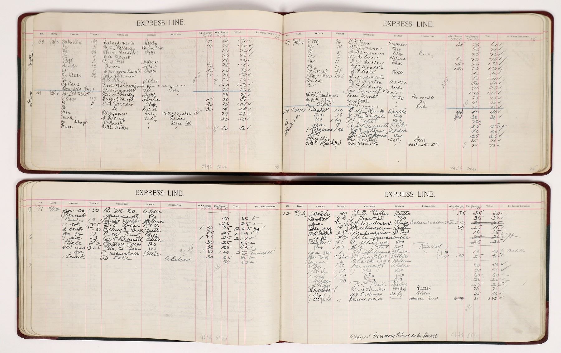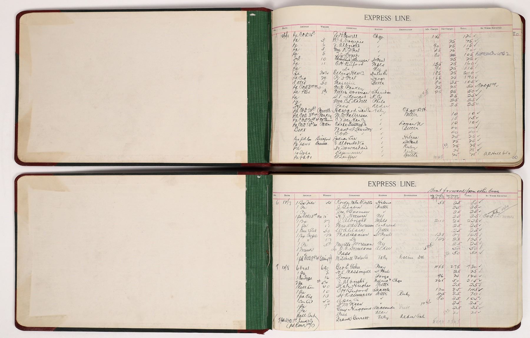 2 Express Line log books c. 1911-12, possibly from Alder Gulch, MT. Has listing for W A Clark bars of bullion. 8.75x14.25".