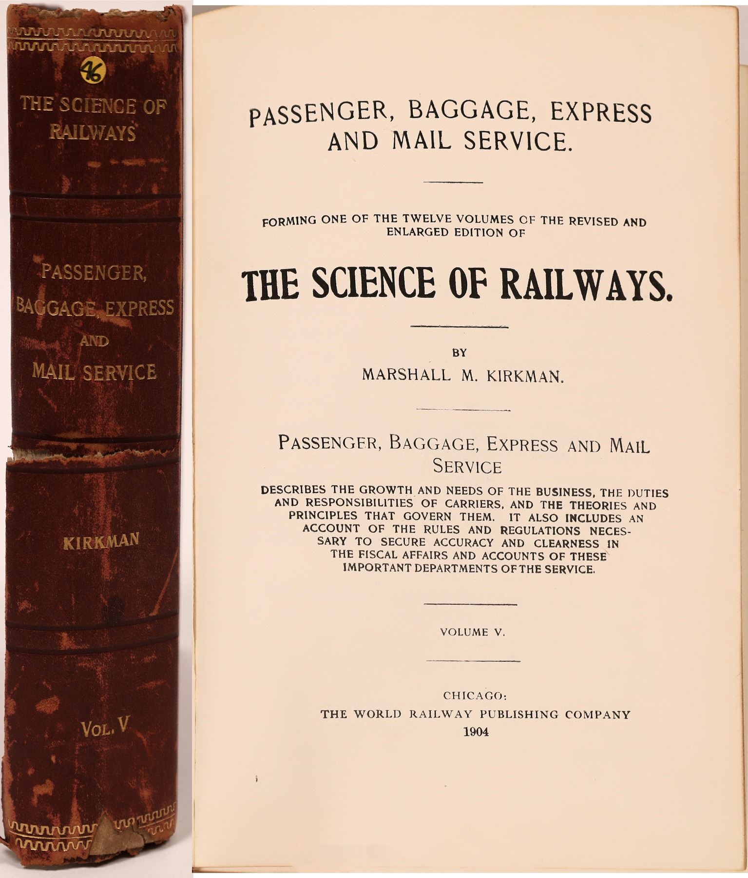 Lot of 2. Primary item is a hardbound book titled The Science of Railways: Passenger, Baggage, Express and Mail Service. By Marshall M. Kirkman. Volume V. Chicago: The World Railway Publishing Company. 1904. 609 pp including Appendix. No photos or engravings. Appendix consists of drawings of various RR documents. Maroon cloth cover intact w/gilt impressed lettering and design on spine. Spine has scuff marks along with minor tear on bottom; lower half of spine cover detached from back cover. Very little foxing on pages. Binding intact. Excellent condition. This is one of 12 volumes Kirkman wrote on the science of railways, first published in 1894. Collection also includes pp 13 - 14 from Scranton magazine, February 1927, pg. 13 displaying a table of package rates for the Loraine & West Virginia RR.