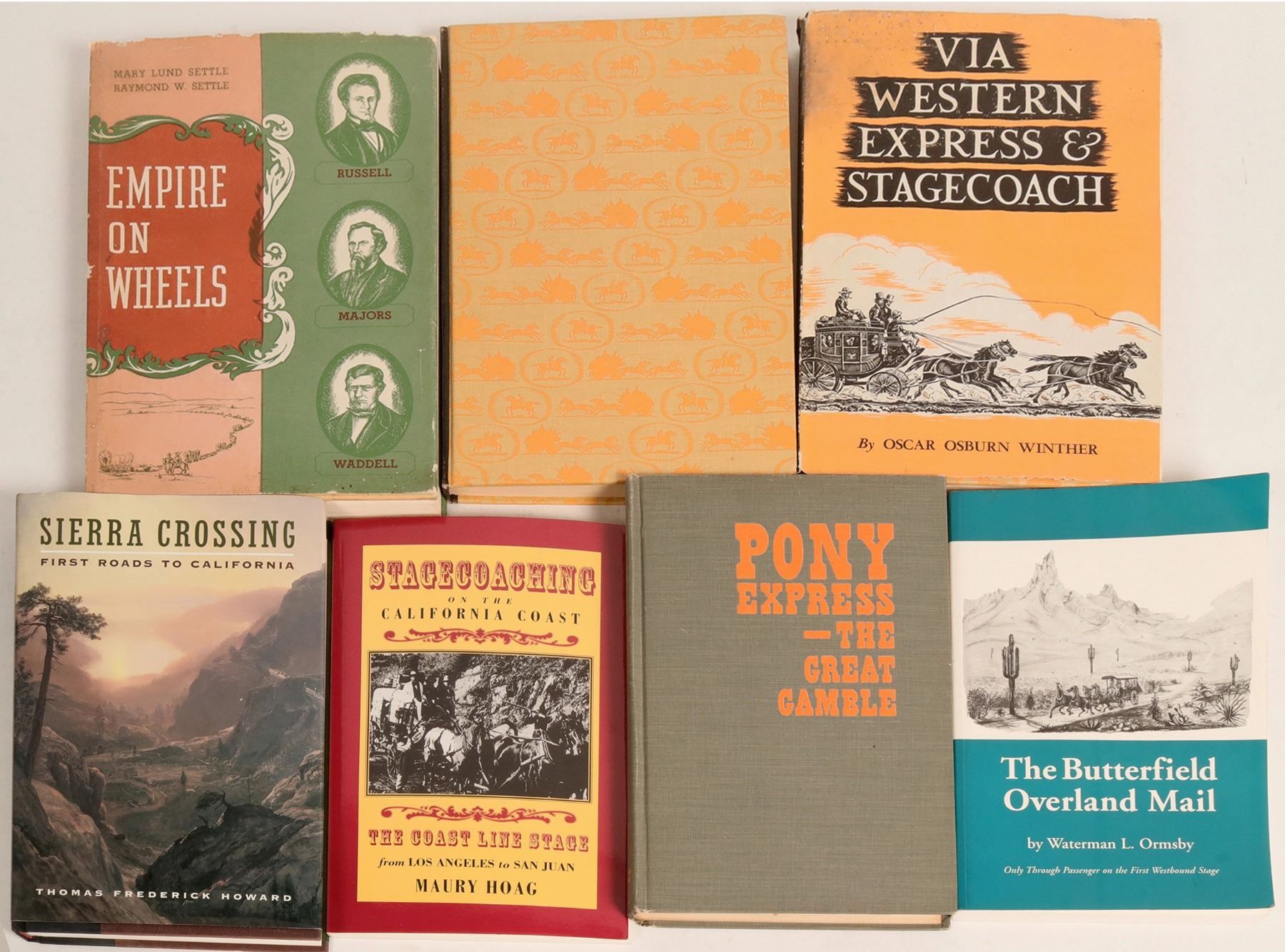 Lot of 7. 1) Stagecoaching on the California Coast, Maury Hoag, 2001, sc. 2) Pony Express--The Great Gamble, Roy Bloss, 1959, hc, no dj. 3) The Butterfield Overland Mail, Waterman L. Ormsby, 1998, sc. 4) Two different editions of Via Western Express & Stagecoach, Oscar Winther. 1945 hc w/o dj., 1947 hc w/ dj. 5) Empire on Wheels, Mary and Raymond Settle, 1949, hc w/dj. 6) Sierra Crossing: First Roads to California, Thomas Howard, 1998, hc w/ dj.